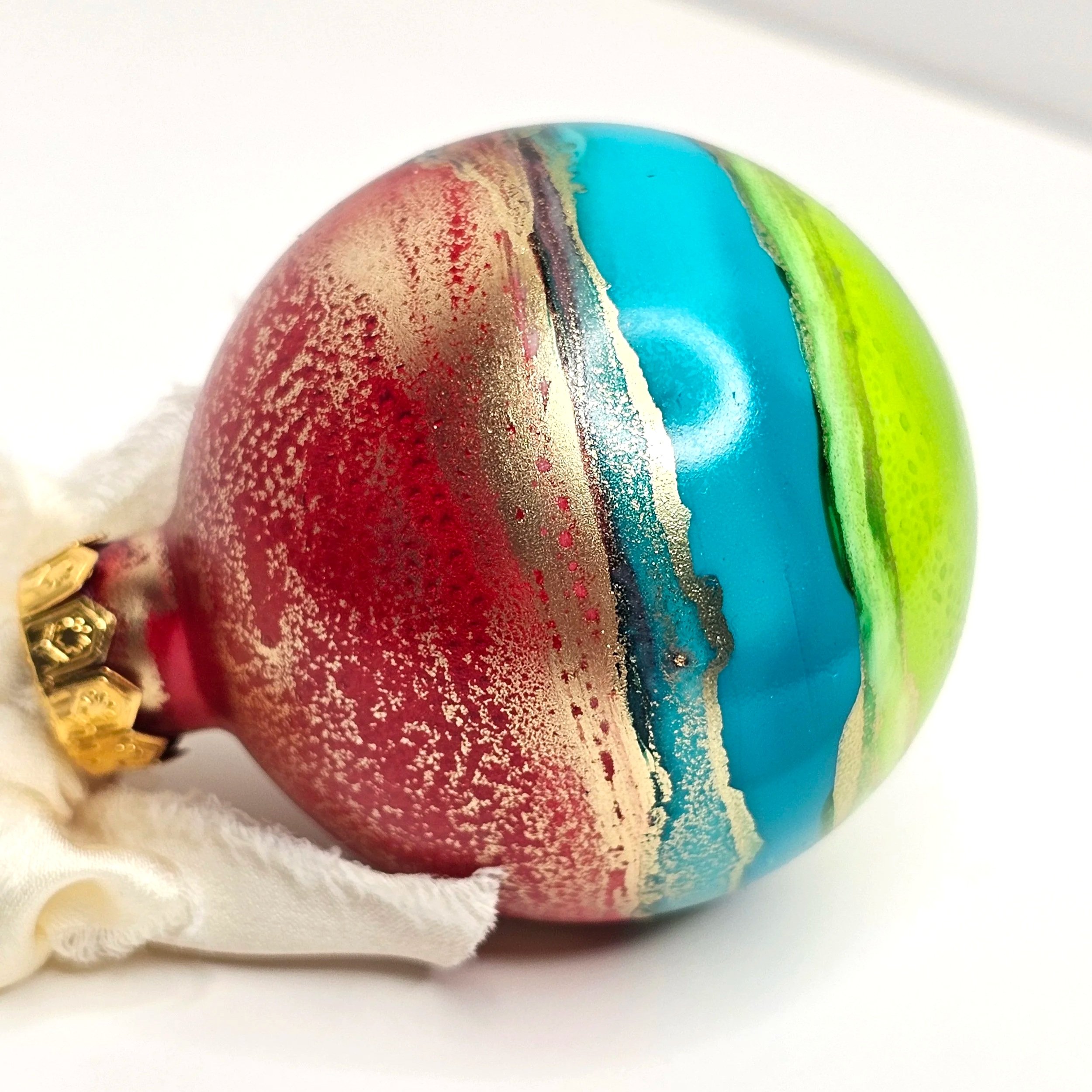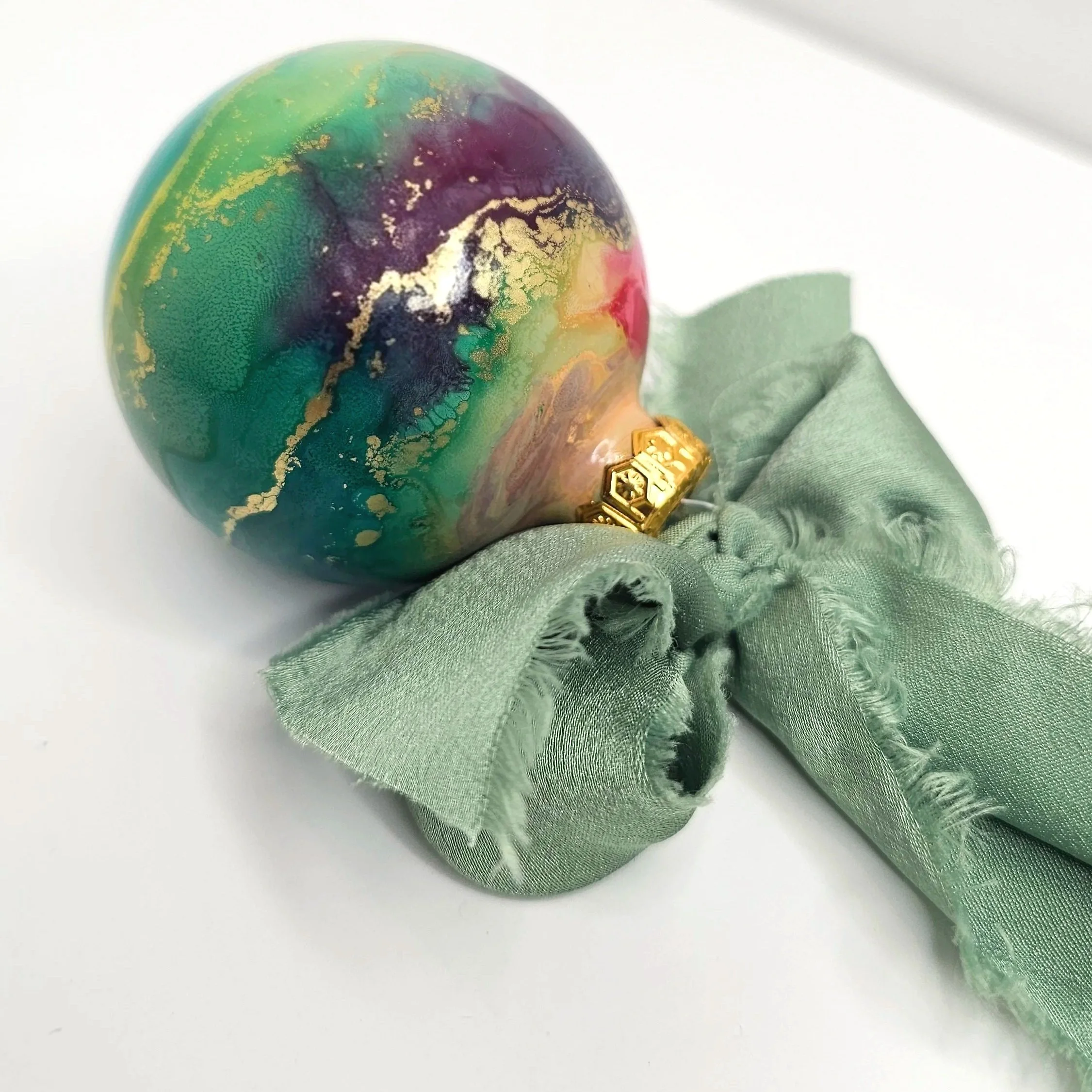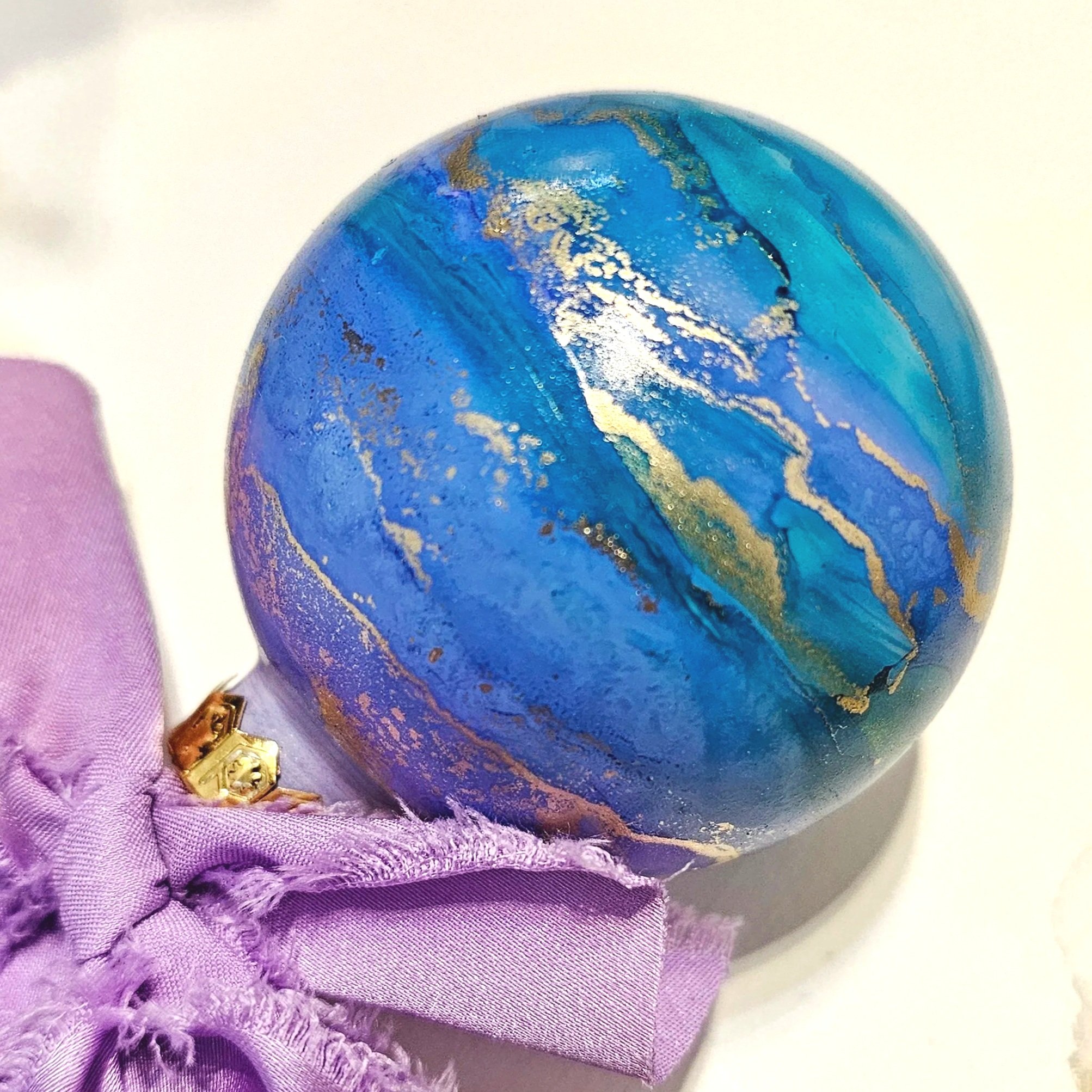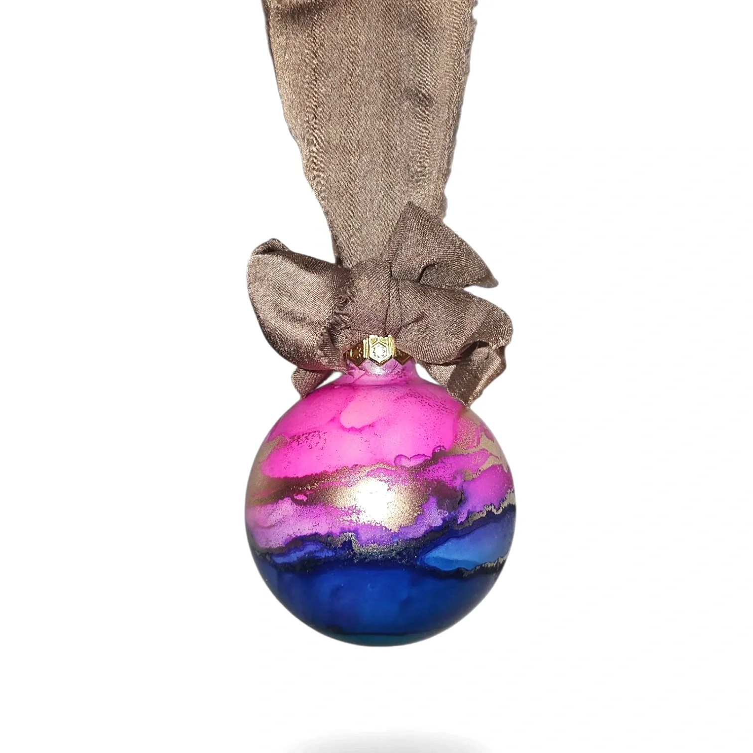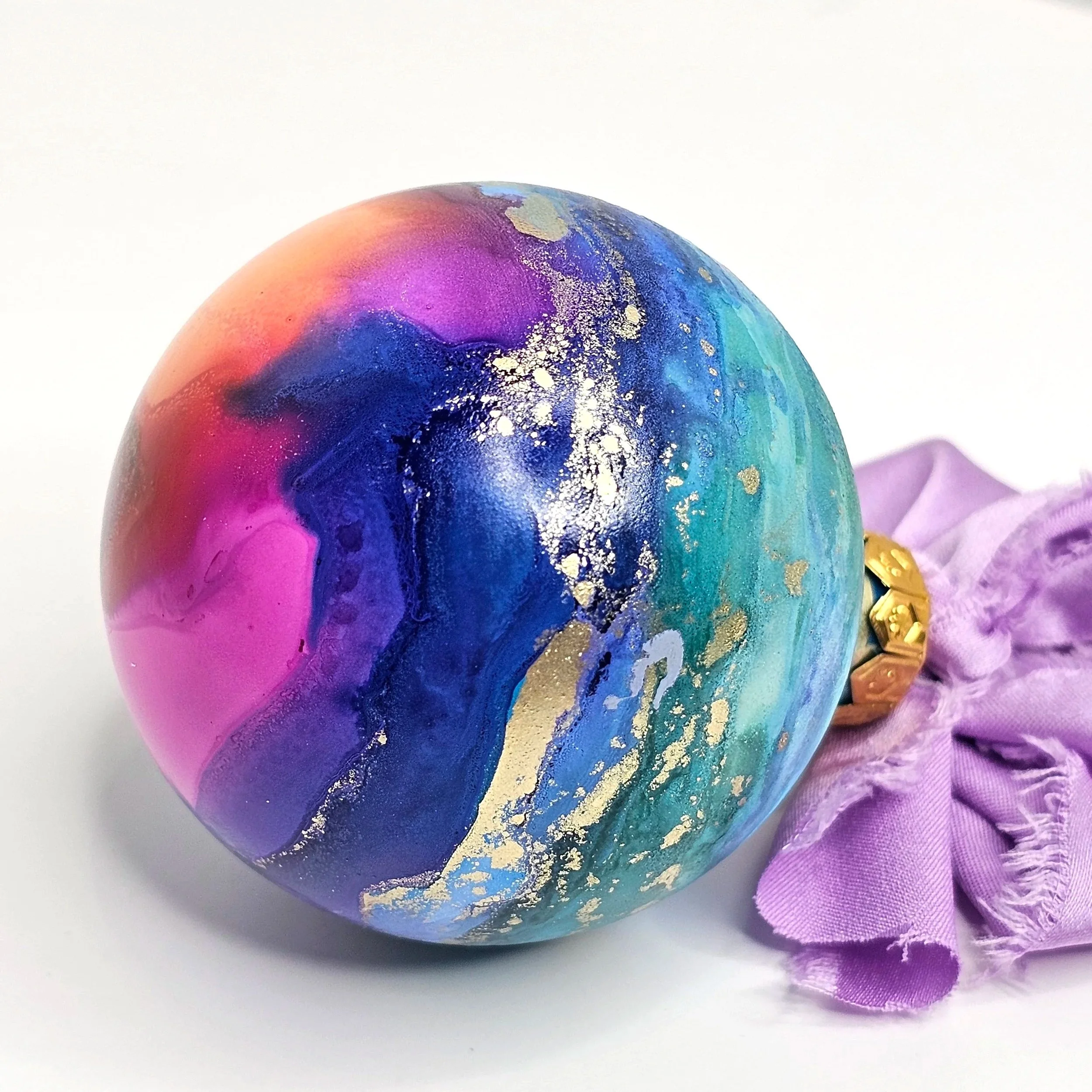• Each 60mm glass ornament is a unique piece of art, hand-painted using vibrant abstract alcohol inks. They feature a gold cap and comes complete with a hand-tied satin ribbon, ready for display.
