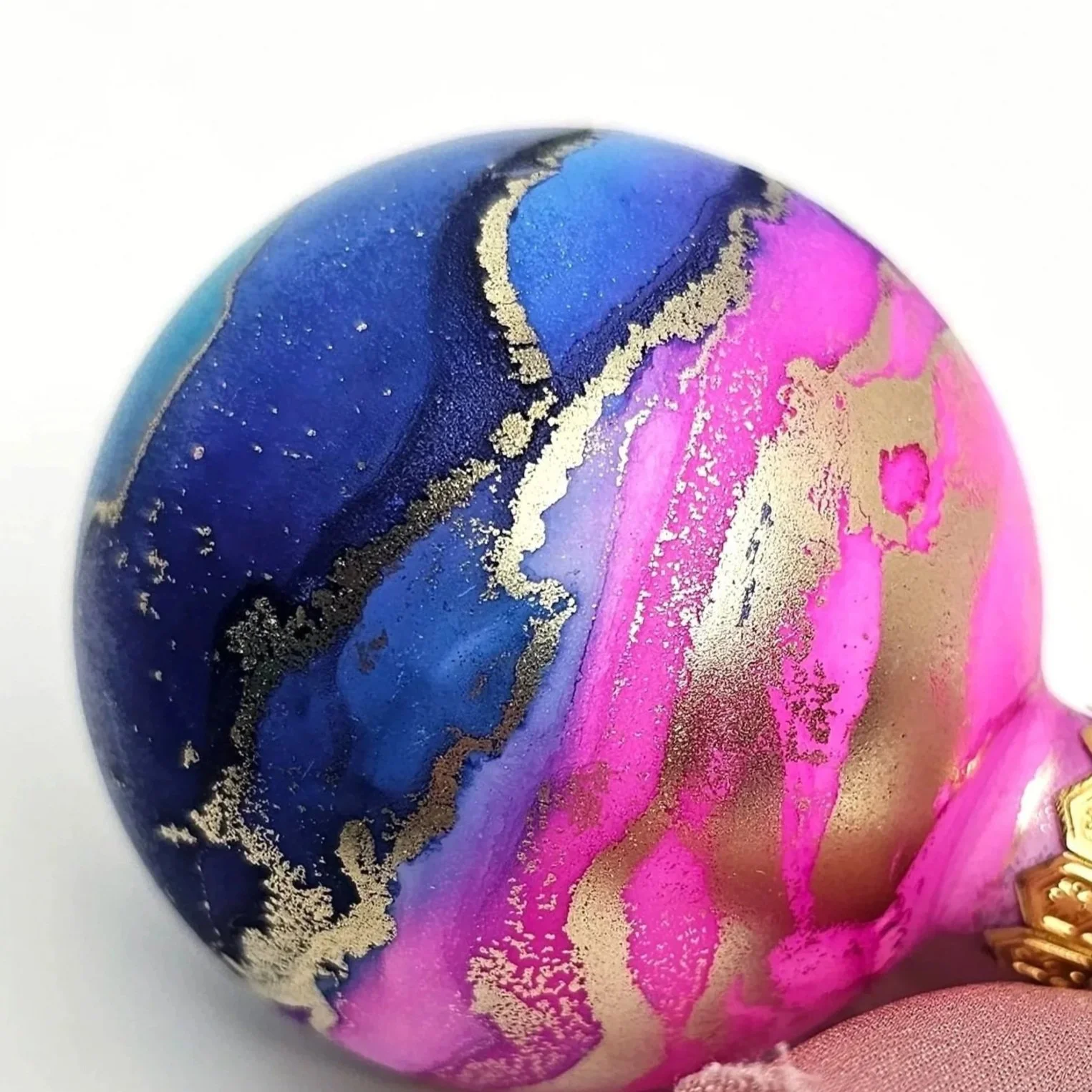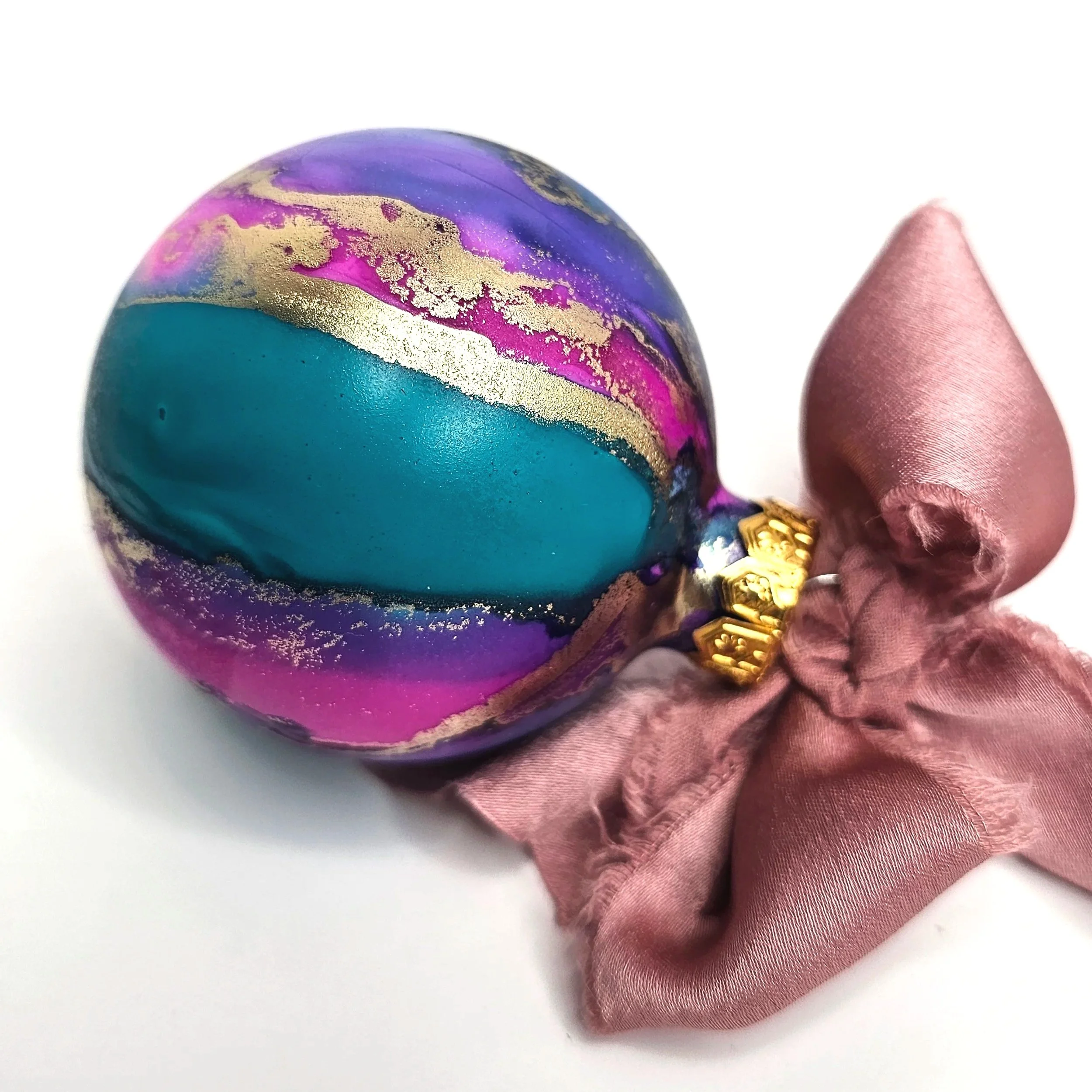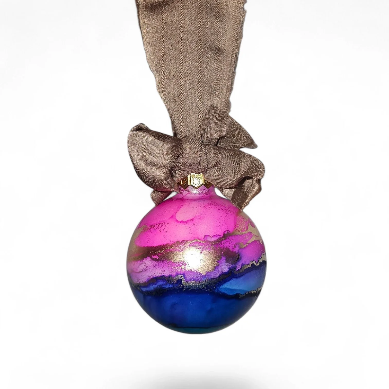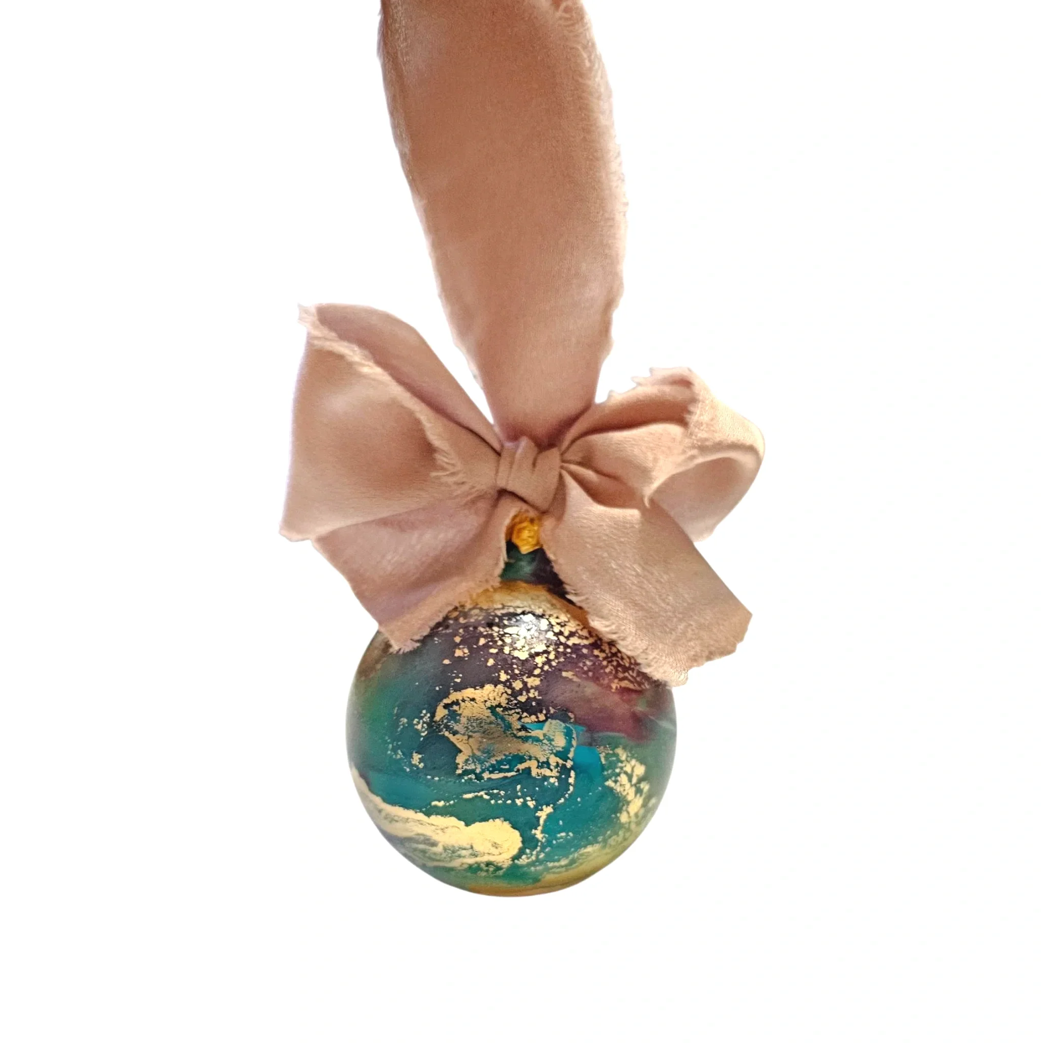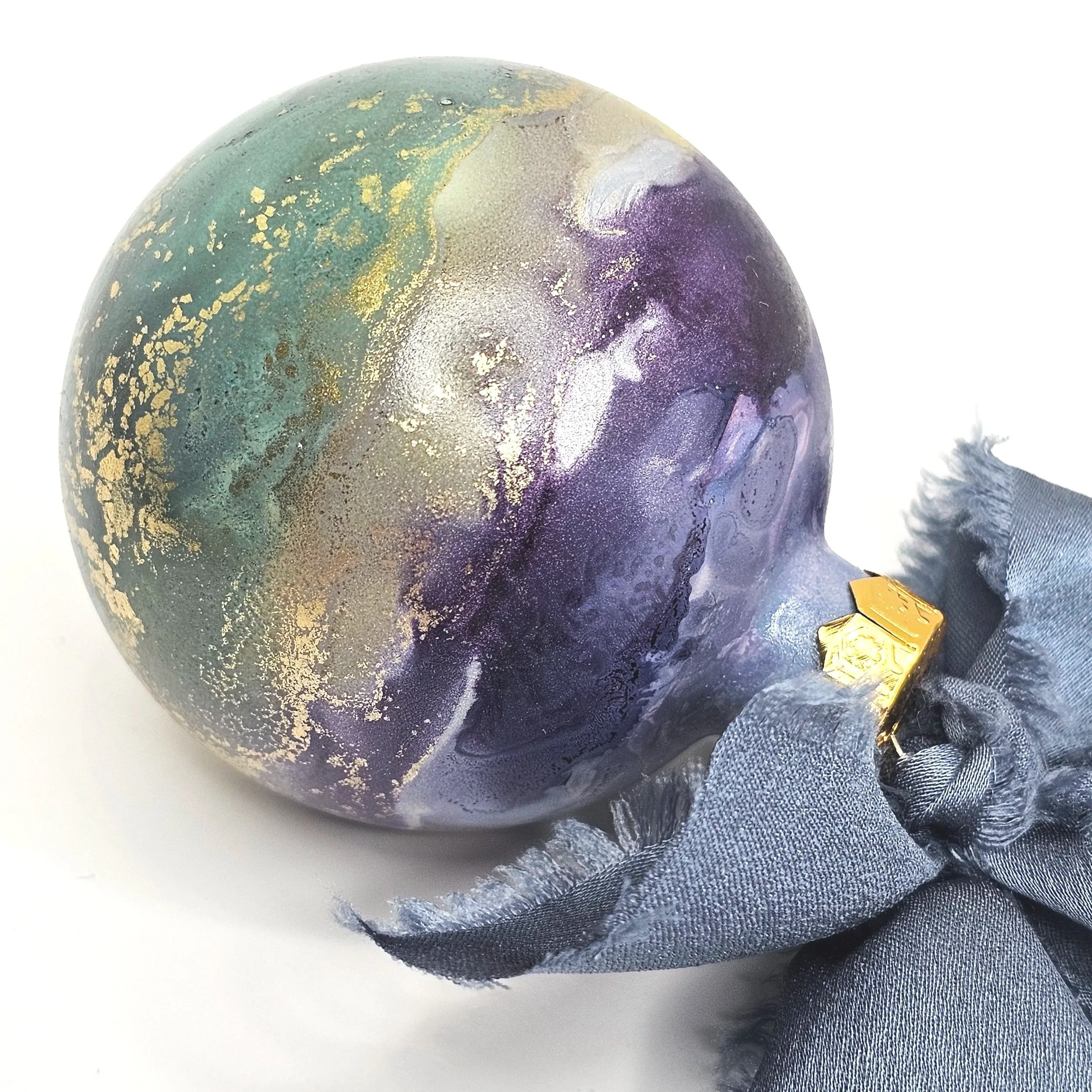• Each 60mm glass ornament is a unique piece of art, hand-painted using vibrant abstract alcohol inks. They feature a gold cap and comes complete with a hand-tied satin ribbon, ready for display.