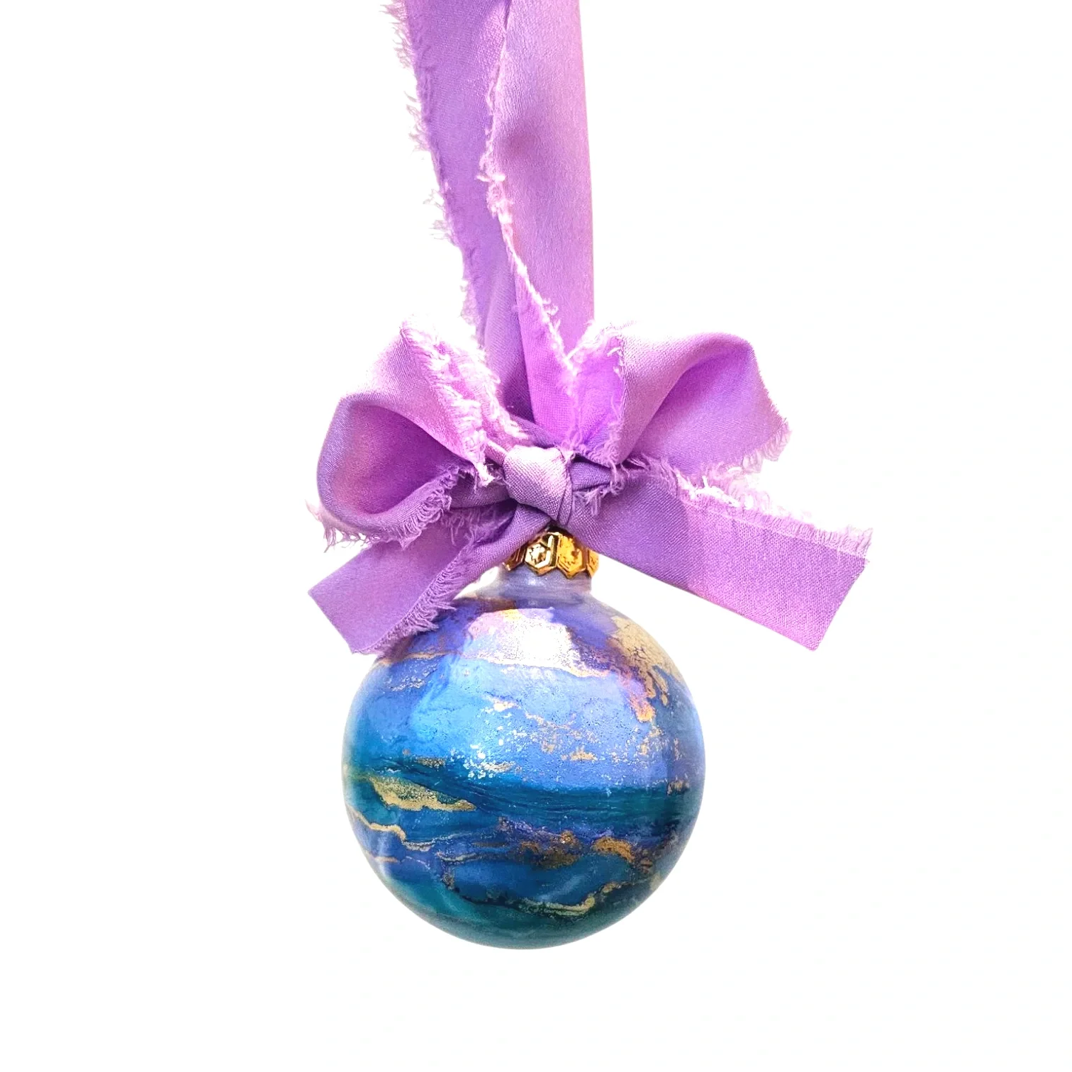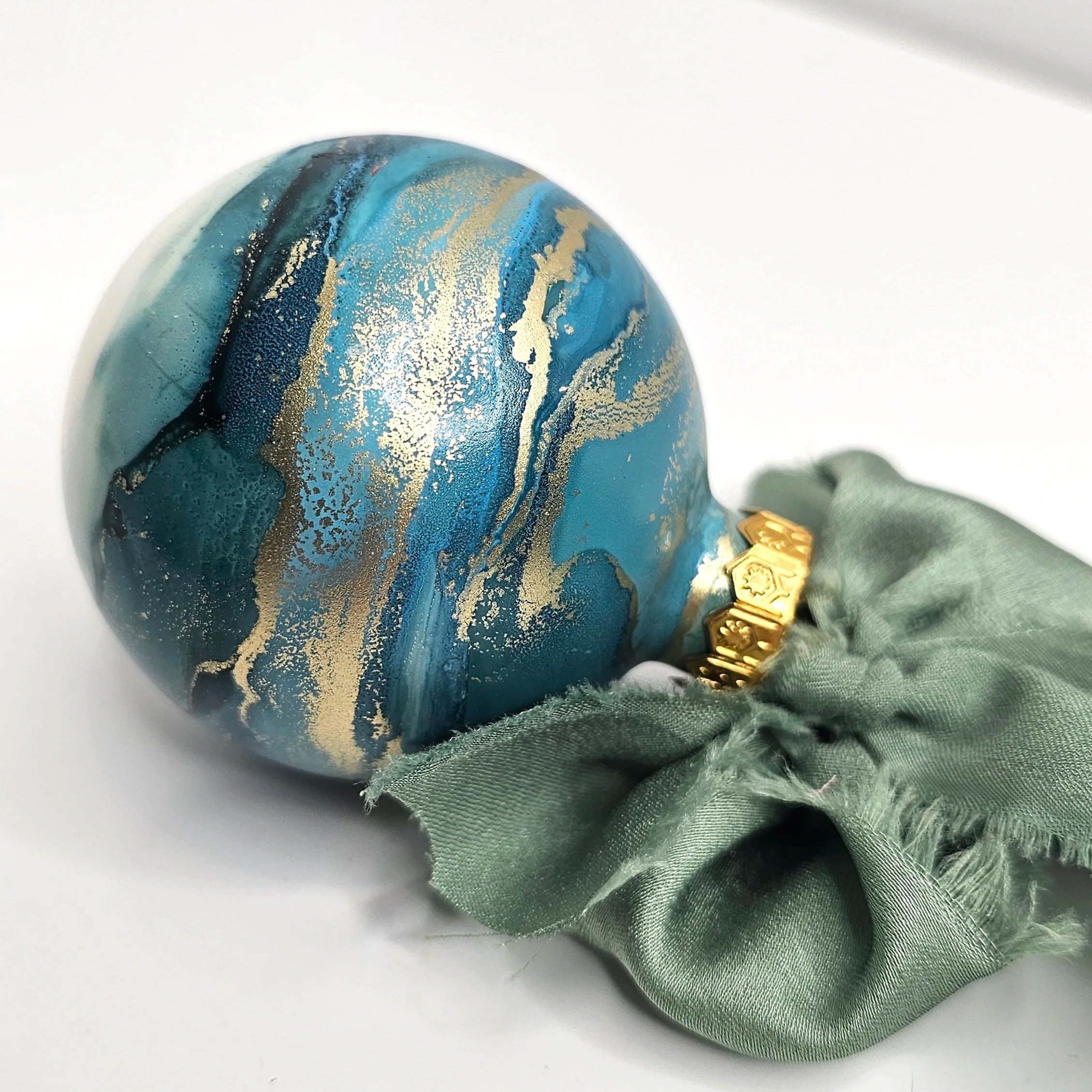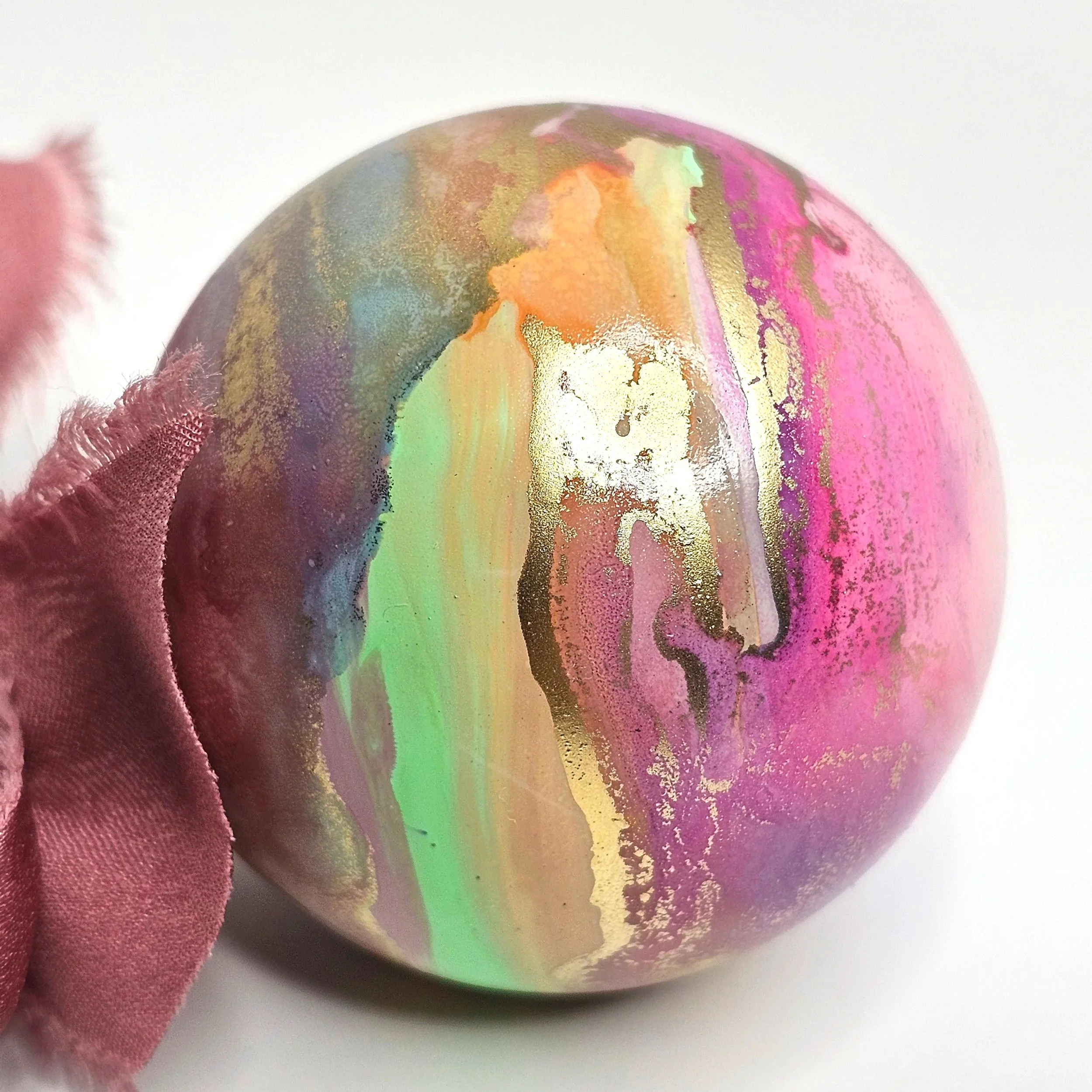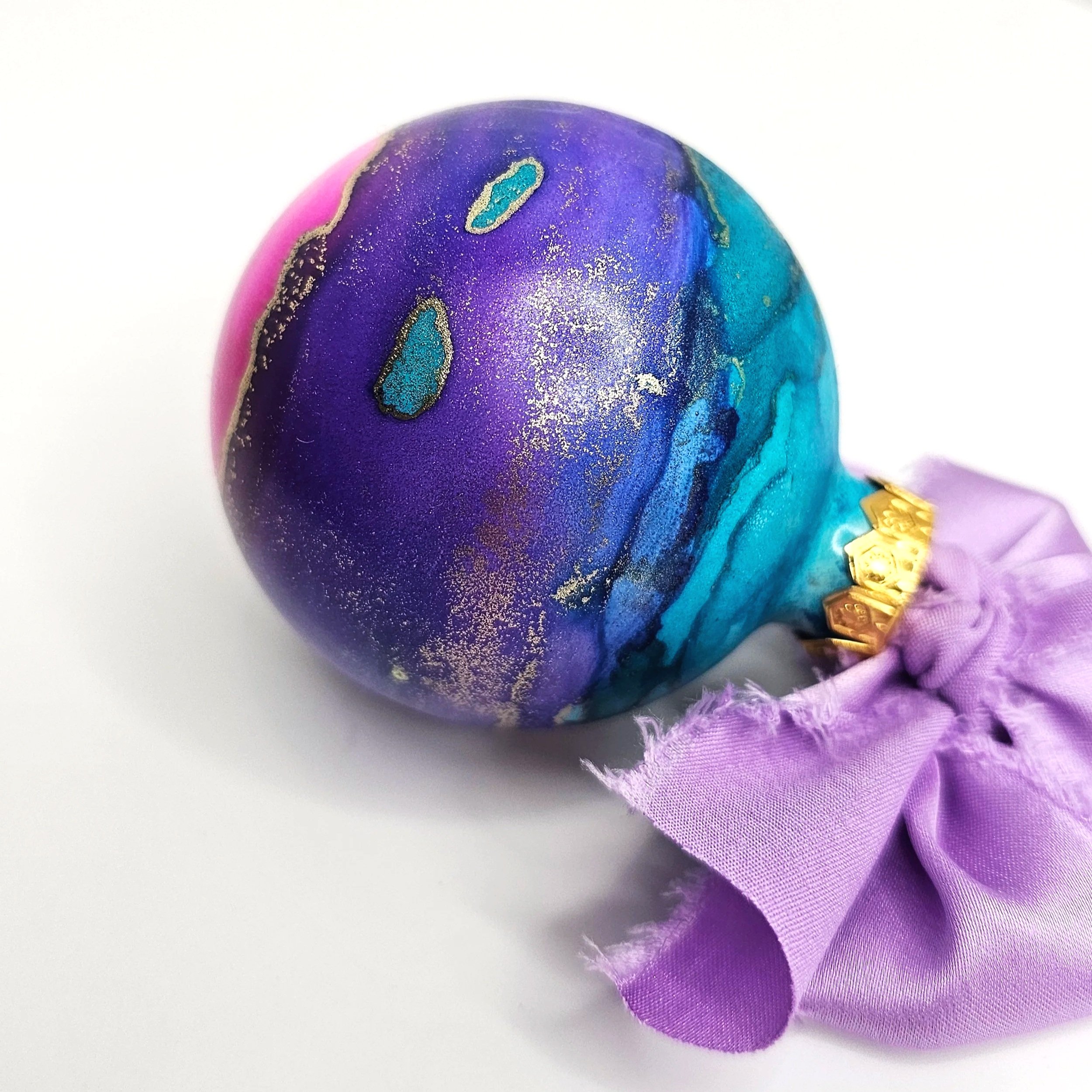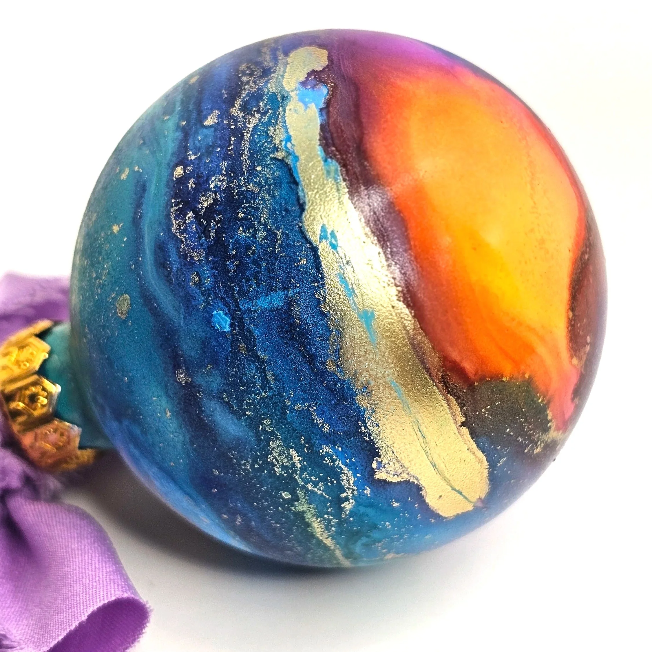 • Each 60mm glass ornament is a unique piece of art, hand-painted using vibrant abstract alcohol inks. They feature a gold cap and comes complete with a hand-tied satin ribbon, ready for display.