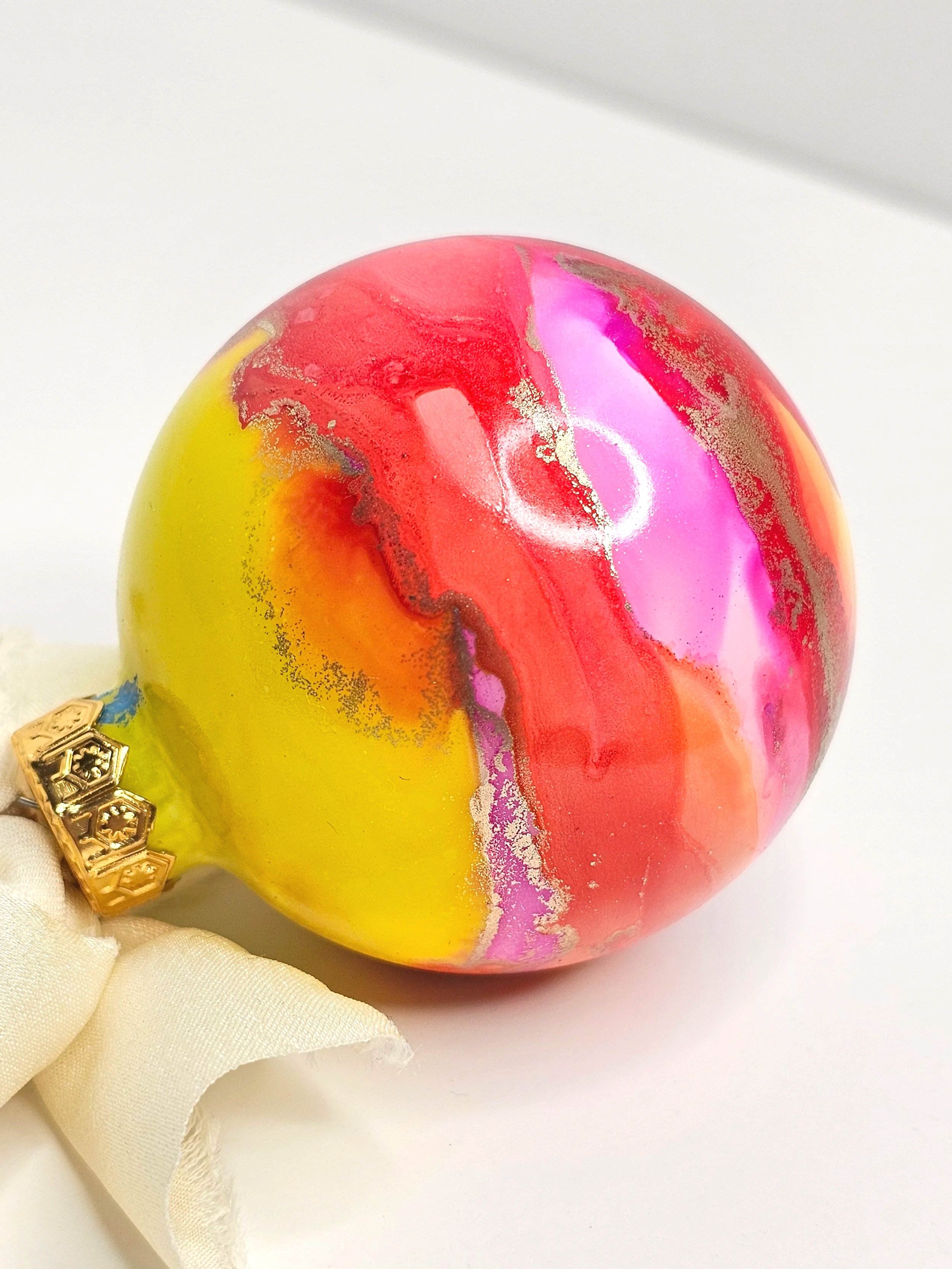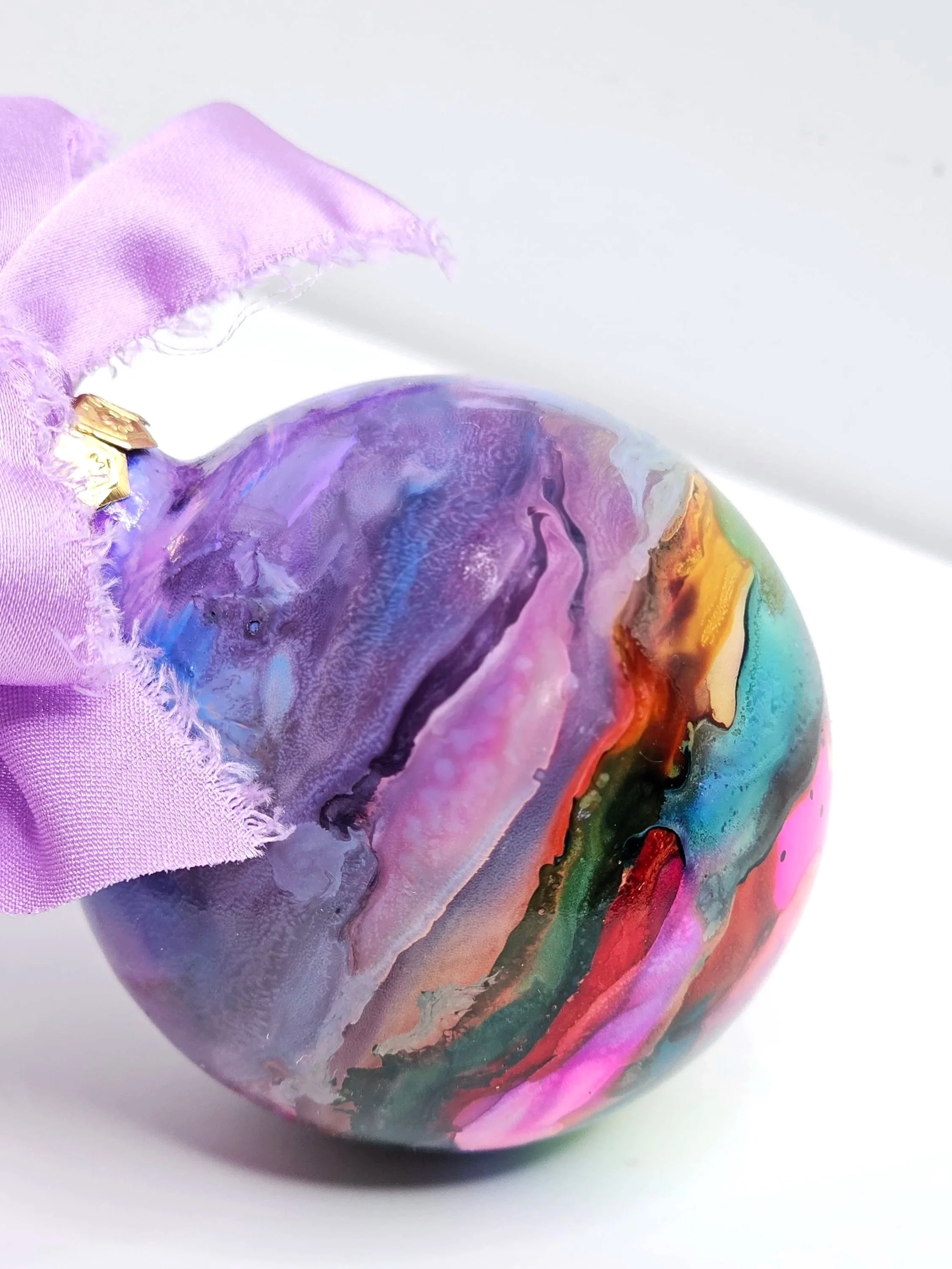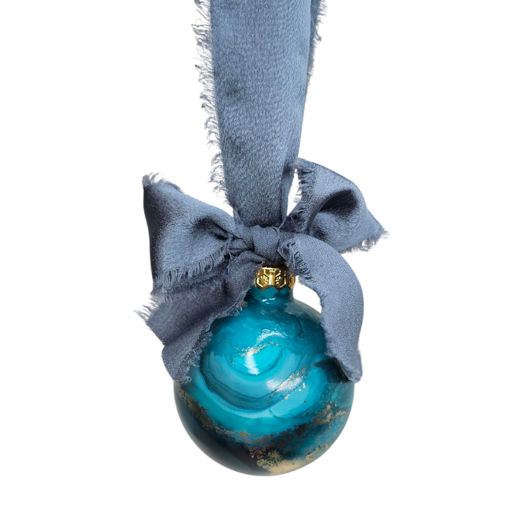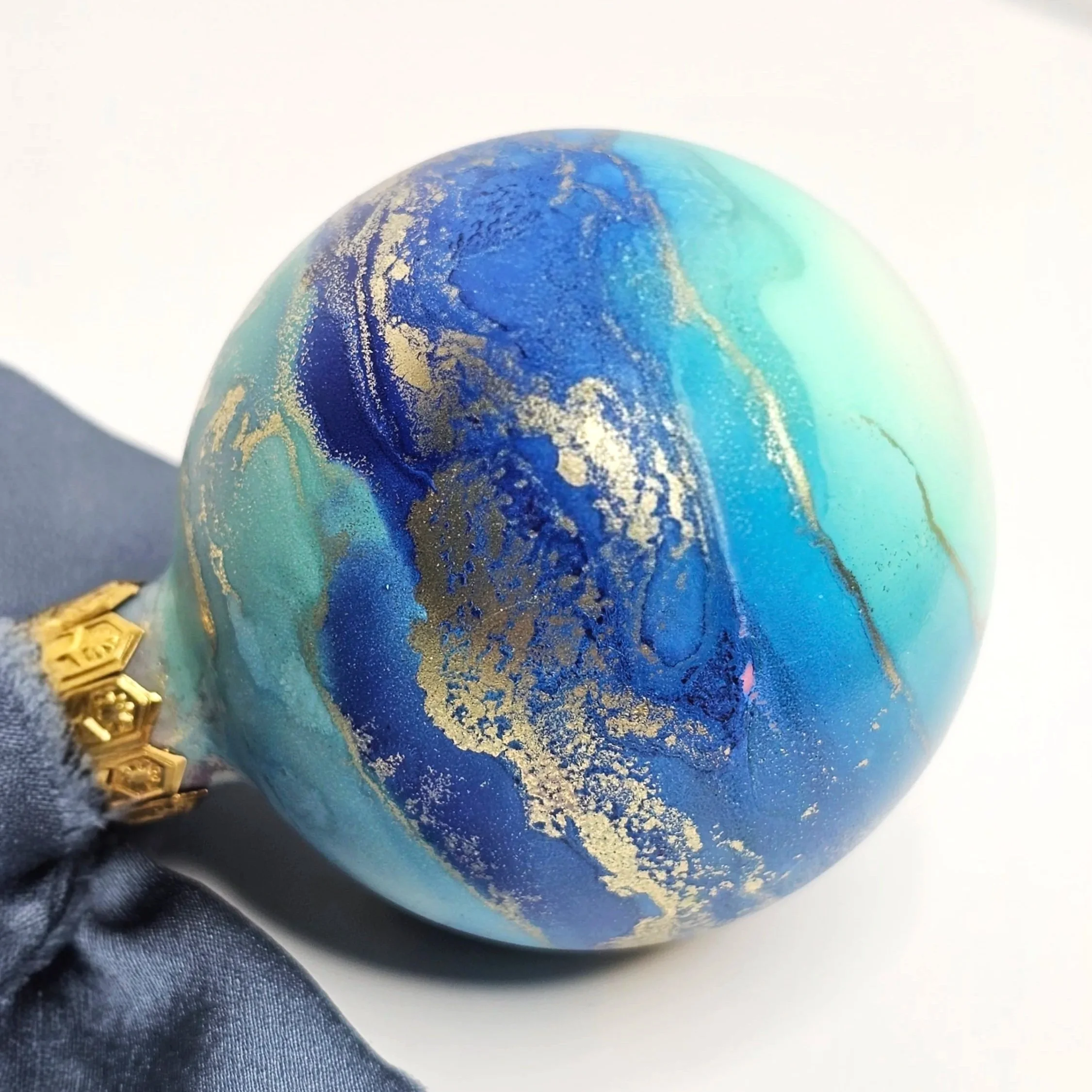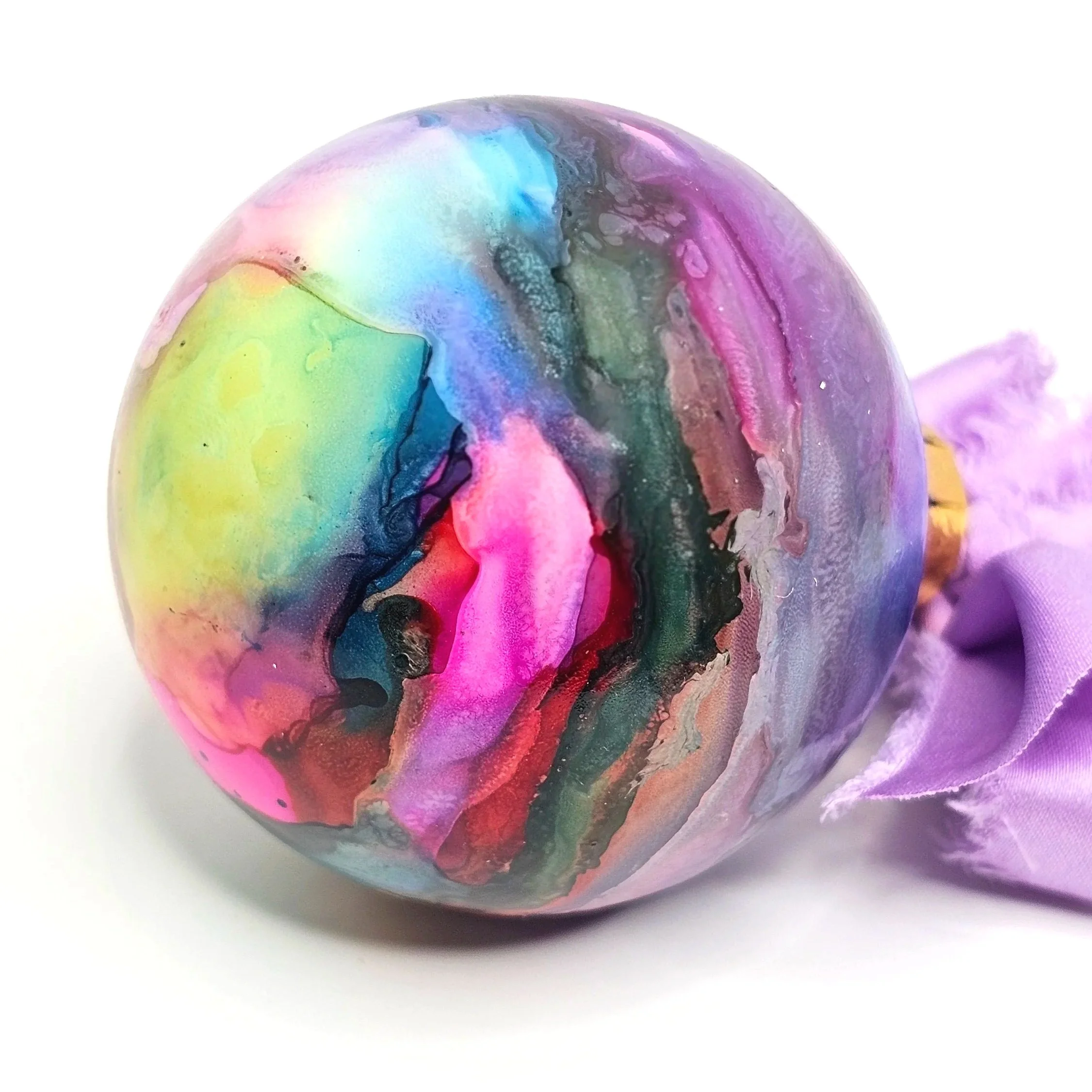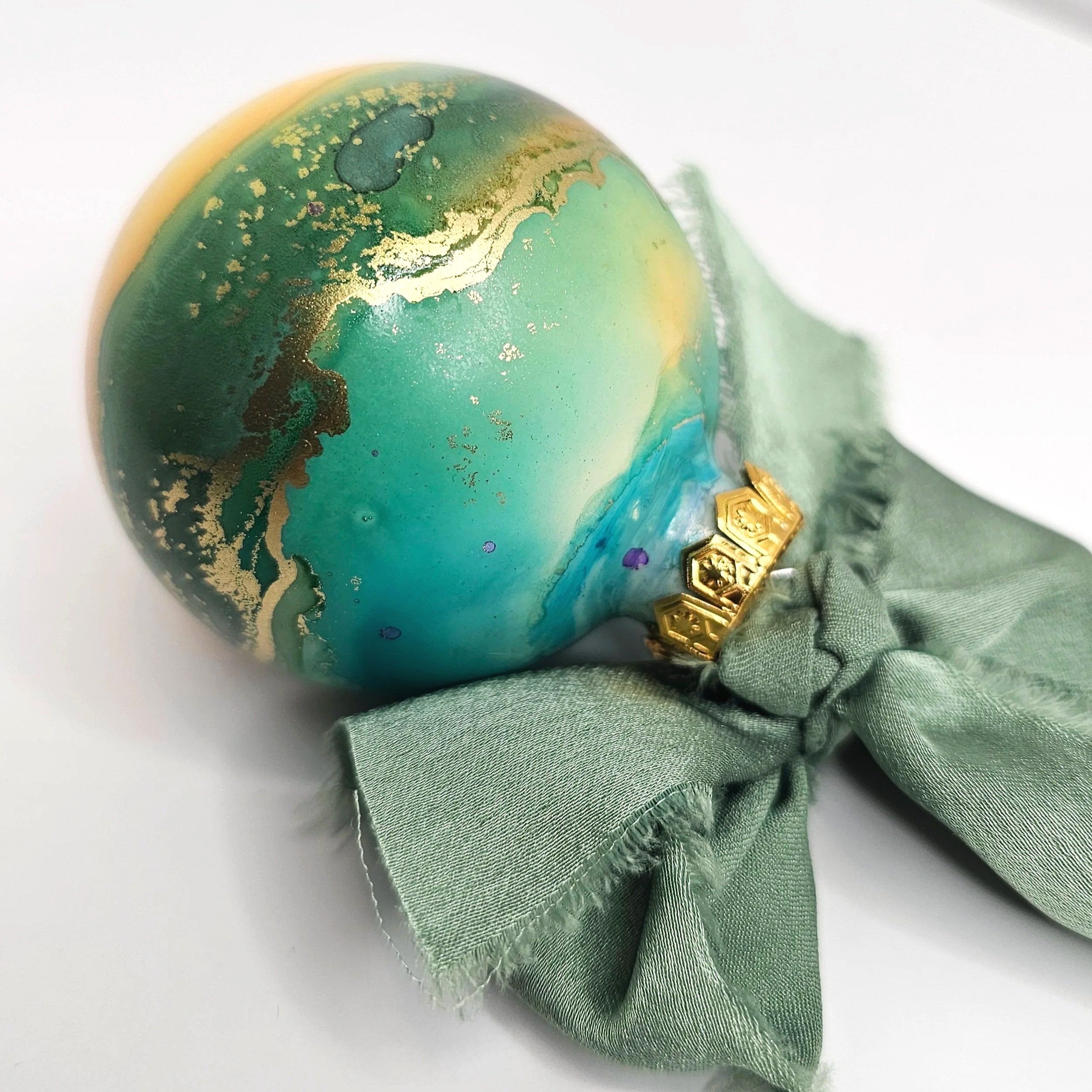 • Each 60mm glass ornament is a unique piece of art, hand-painted using vibrant abstract alcohol inks. They feature a gold cap and comes complete with a hand-tied satin ribbon, ready for display.