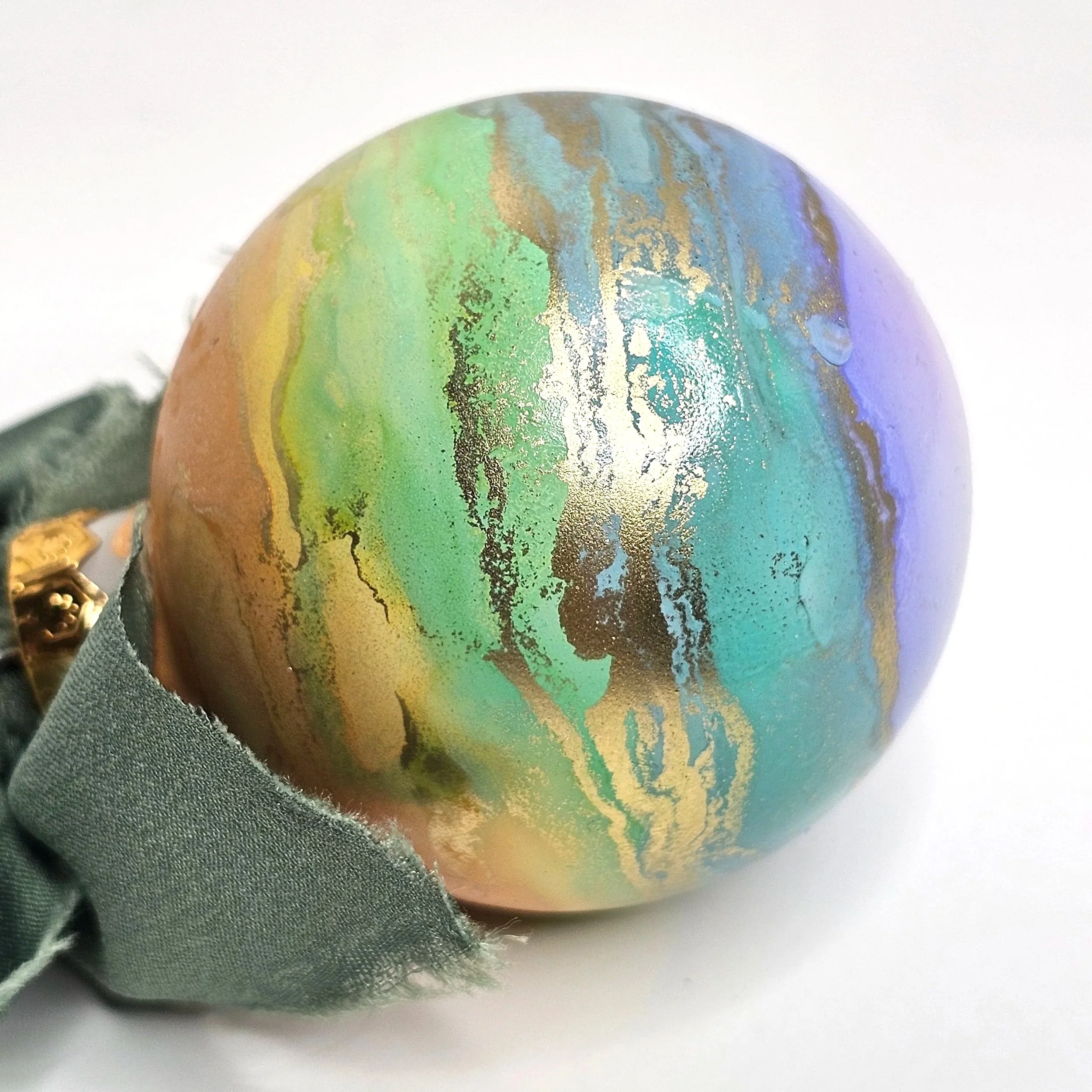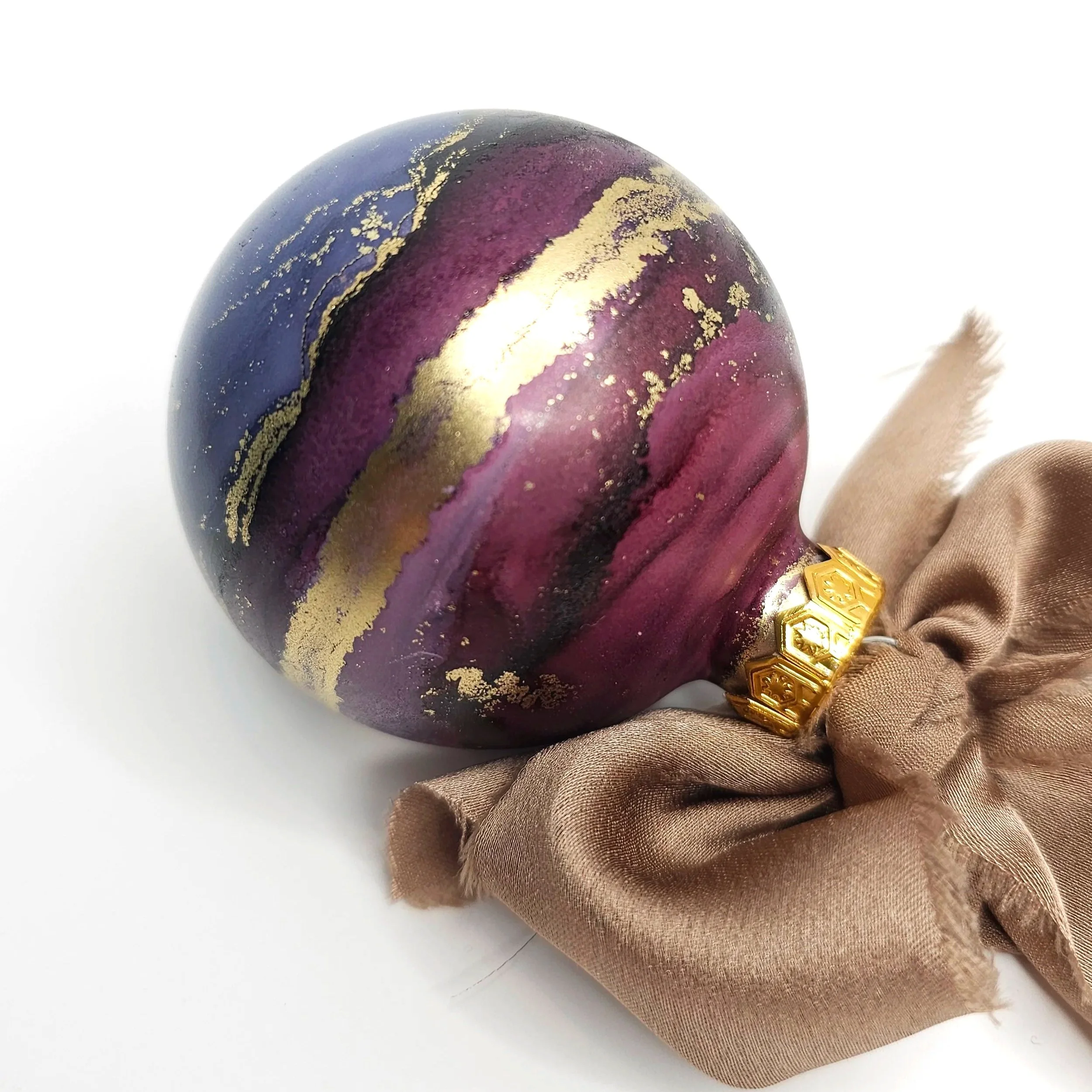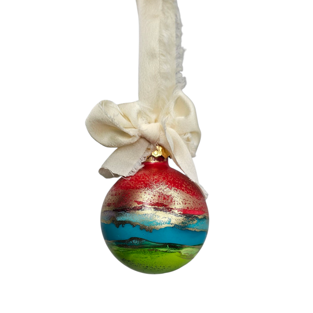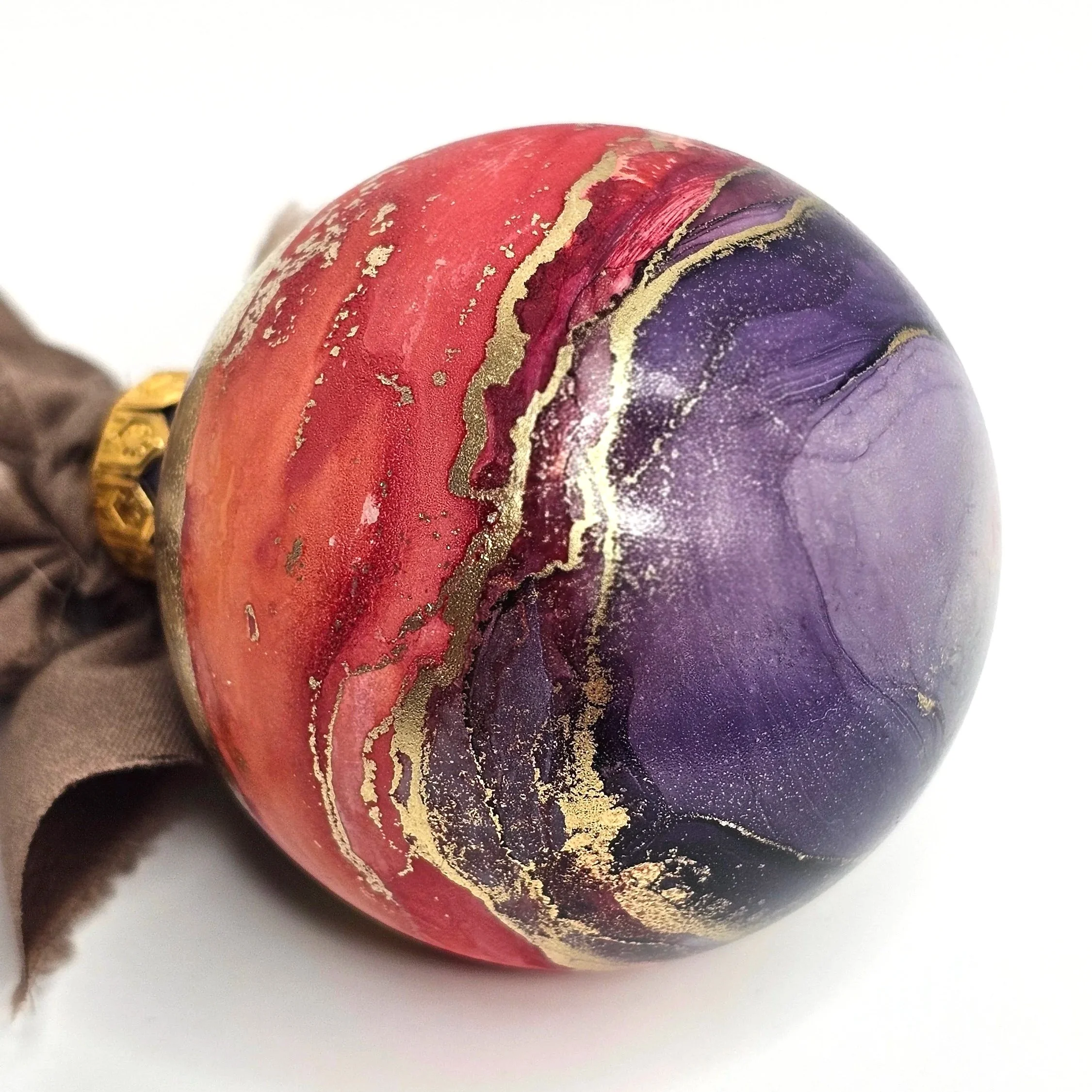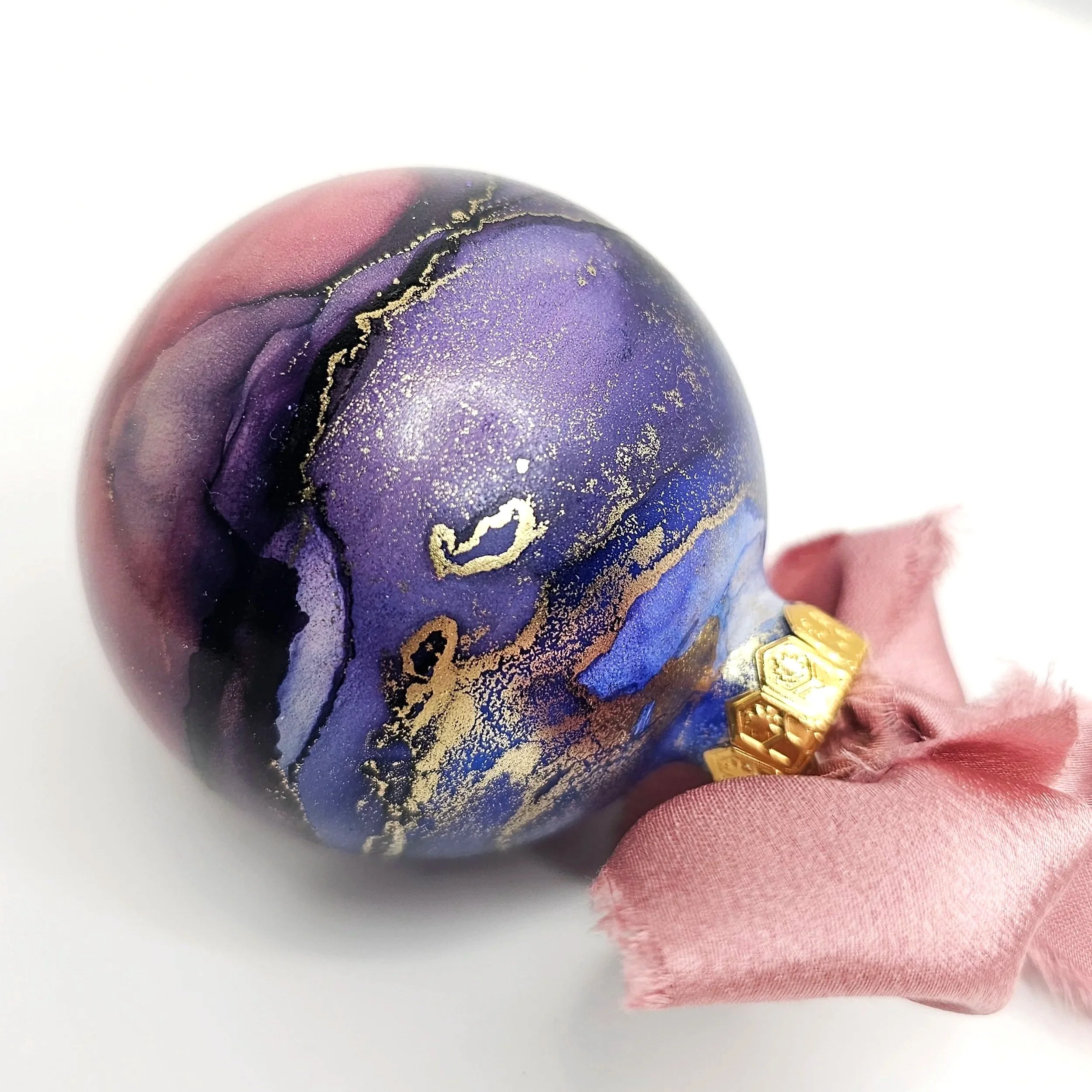 • Each 60mm glass ornament is a unique piece of art, hand-painted using vibrant abstract alcohol inks. They feature a gold cap and comes complete with a hand-tied satin ribbon, ready for display.
