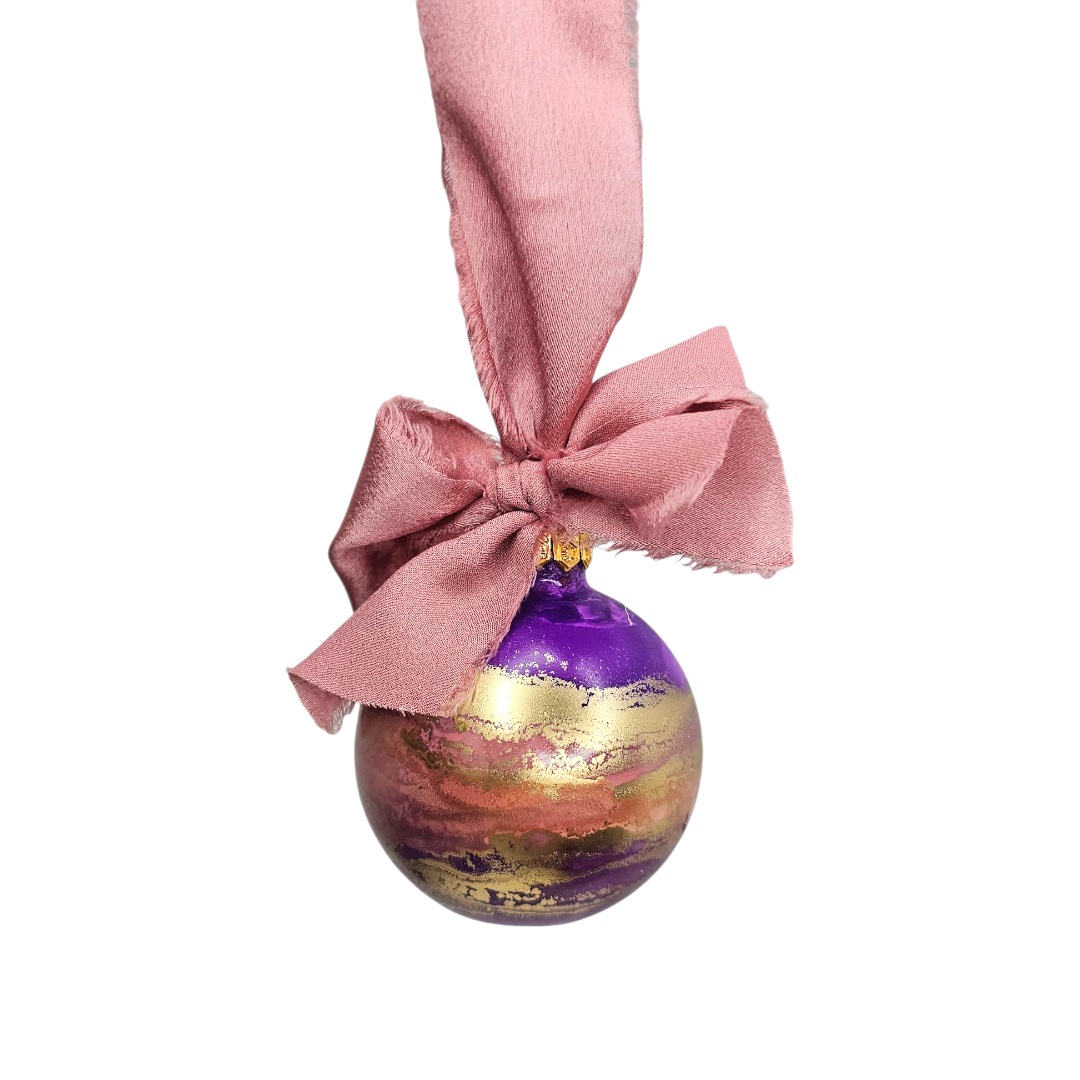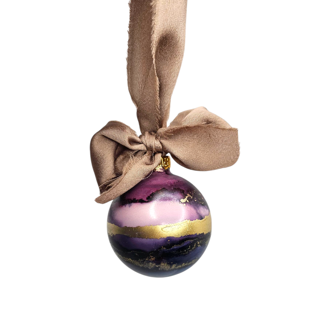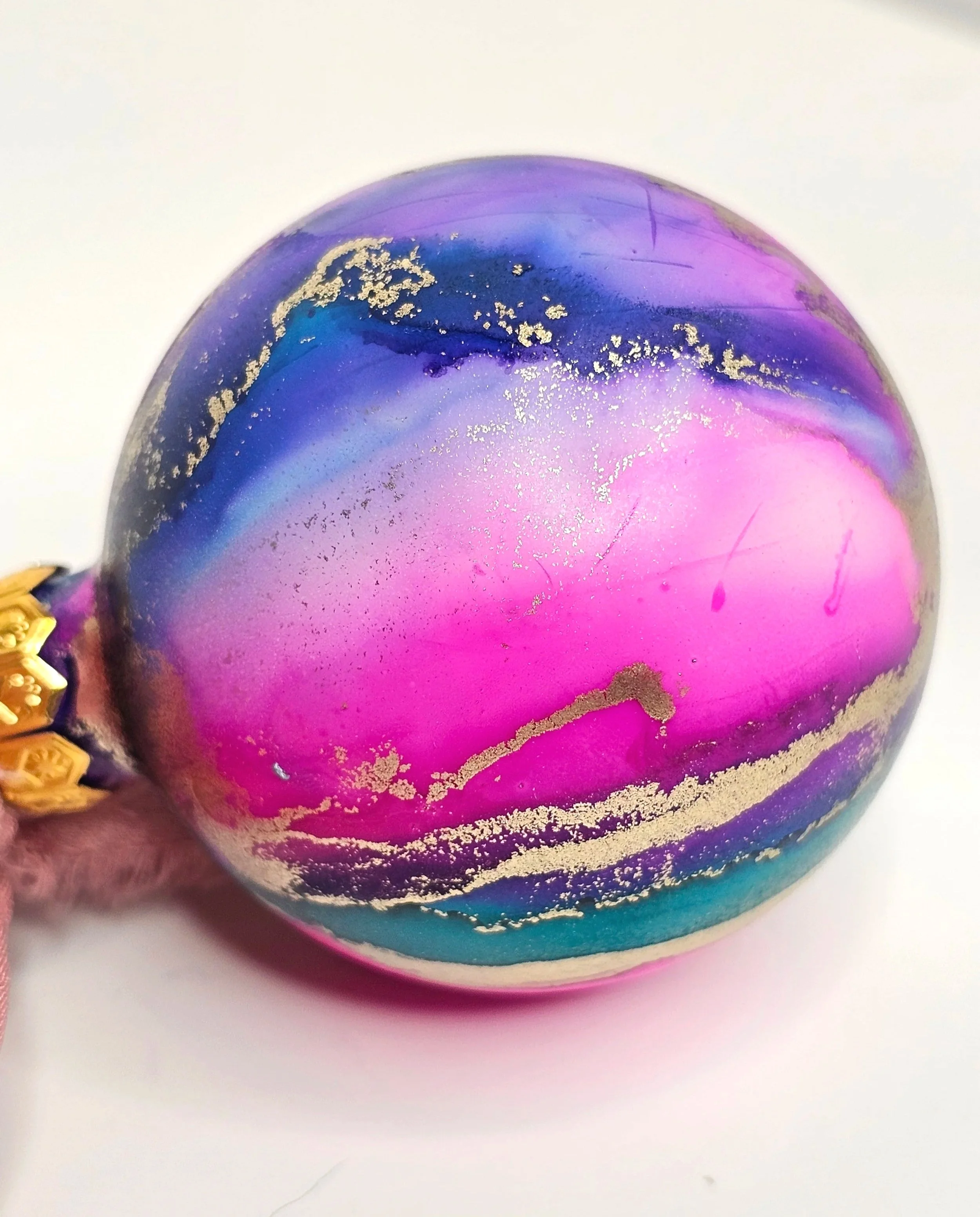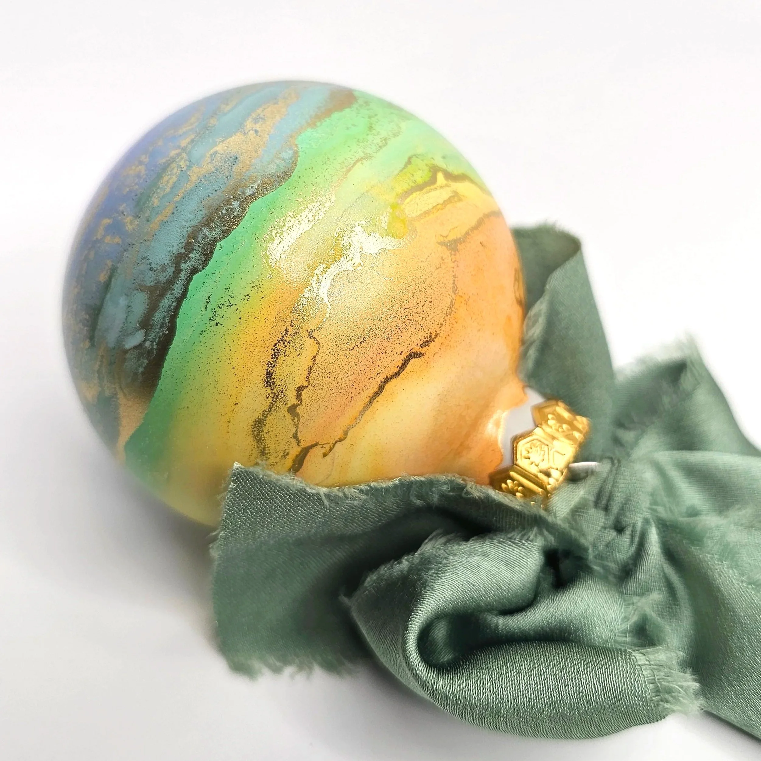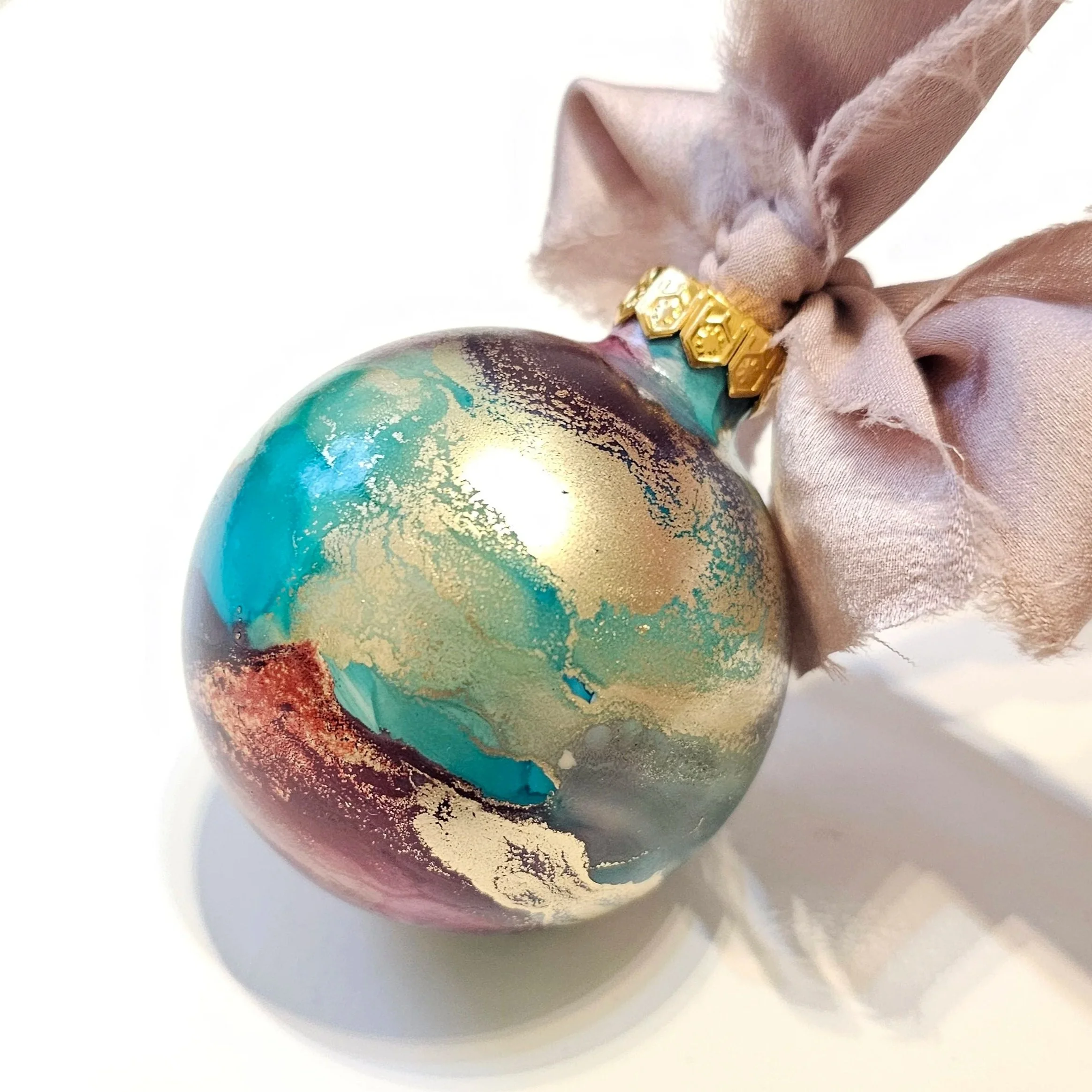 • Each 60mm glass ornament is a unique piece of art, hand-painted using vibrant abstract alcohol inks. They feature a gold cap and comes complete with a hand-tied satin ribbon, ready for display.