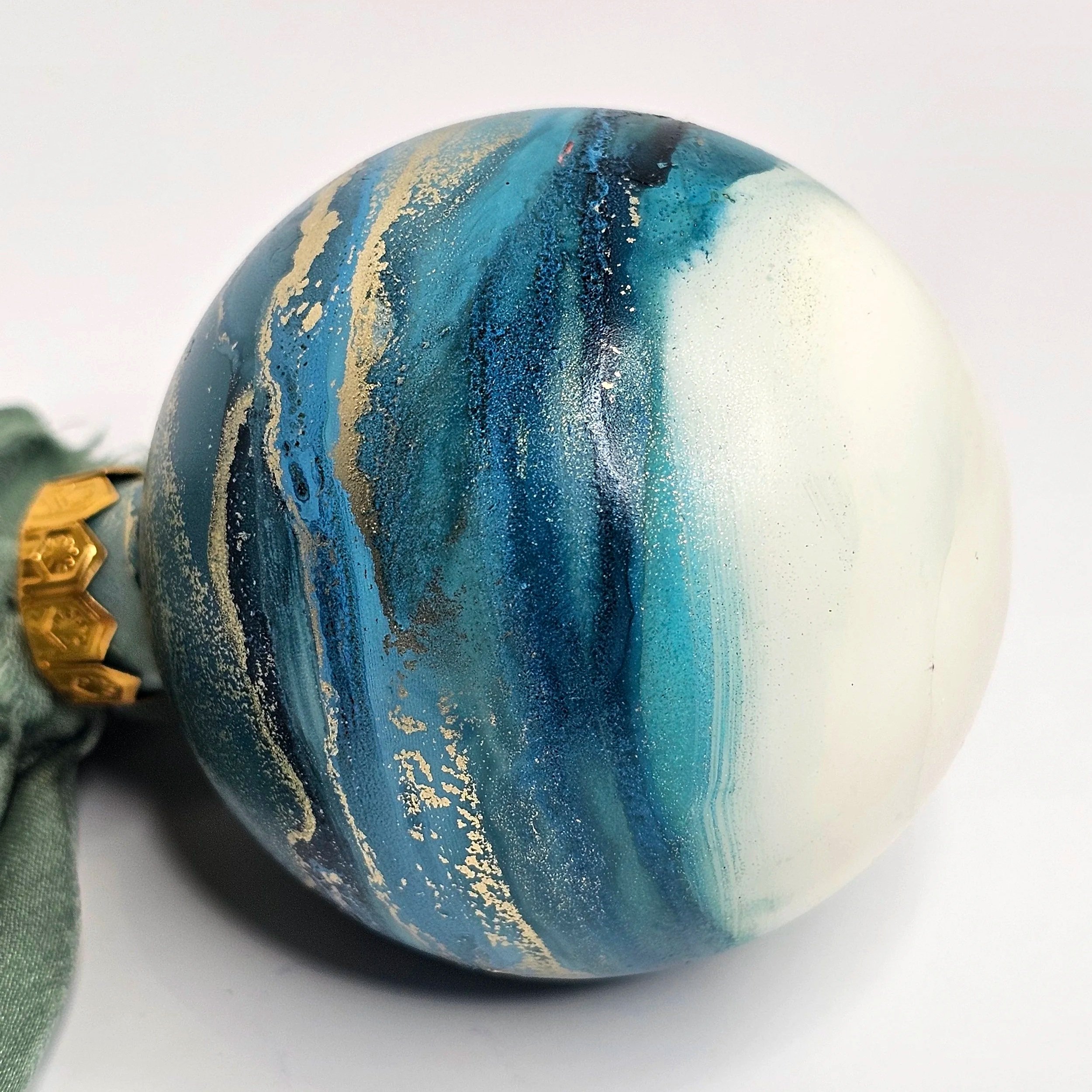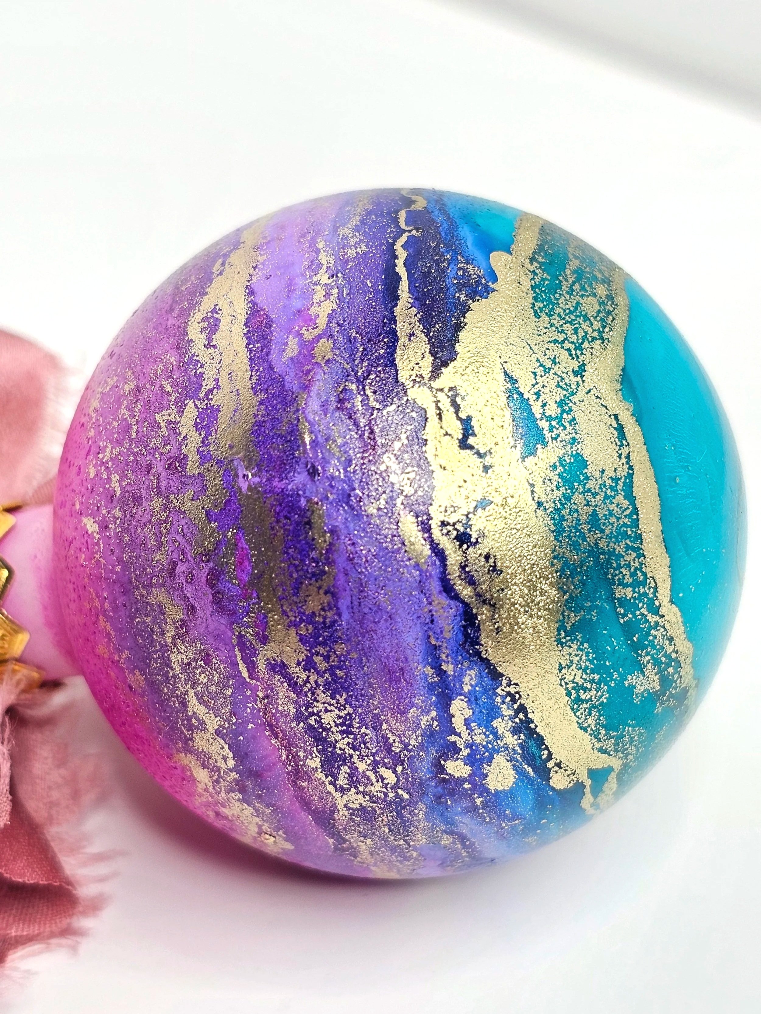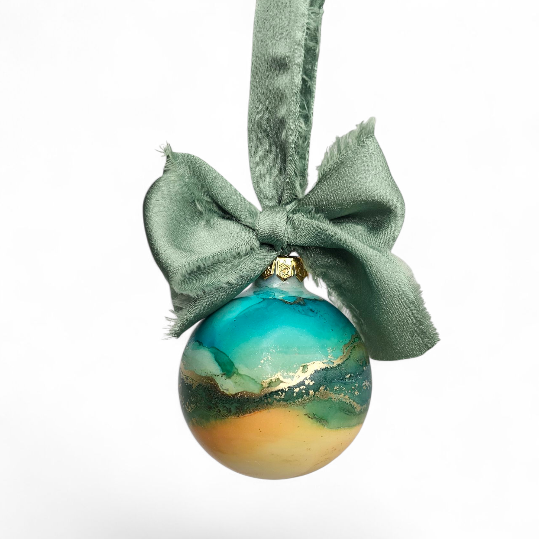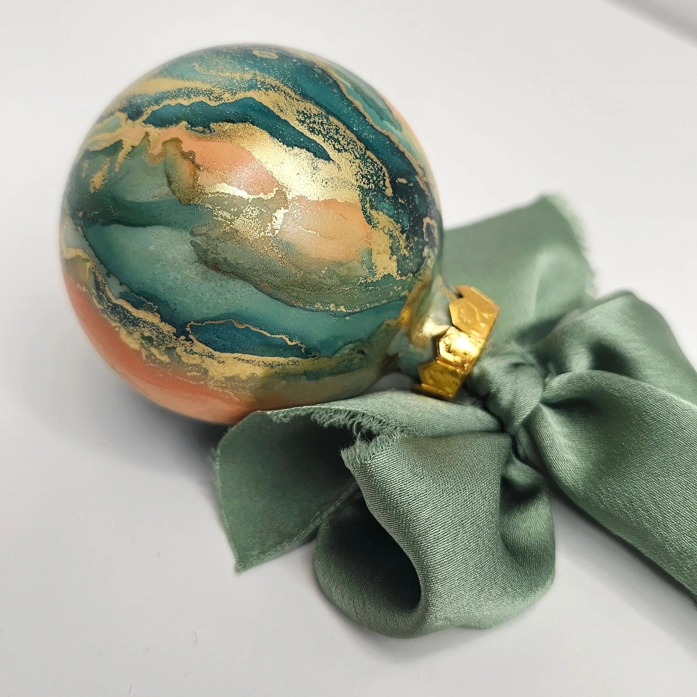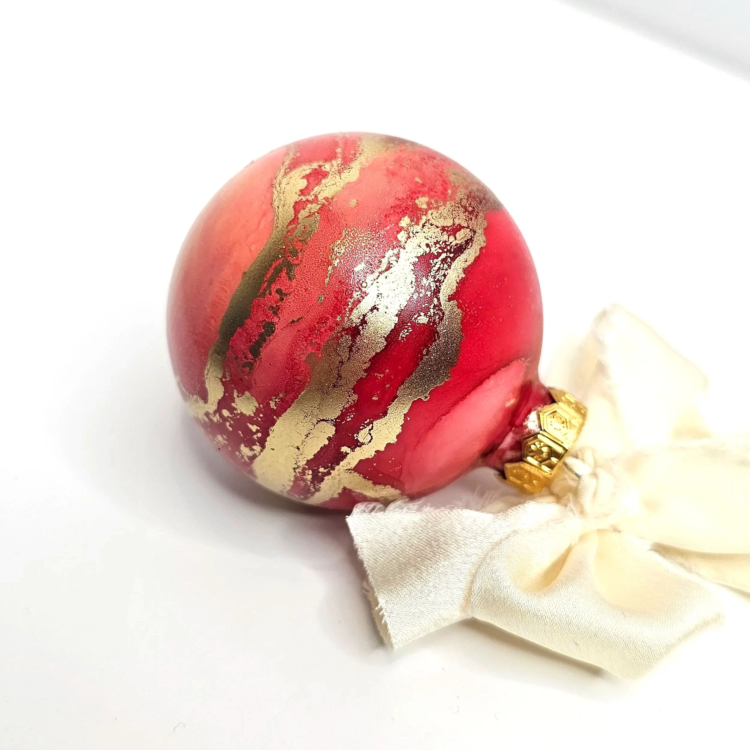 • Each 60mm glass ornament is a unique piece of art, hand-painted using vibrant abstract alcohol inks. They feature a gold cap and comes complete with a hand-tied satin ribbon, ready for display.