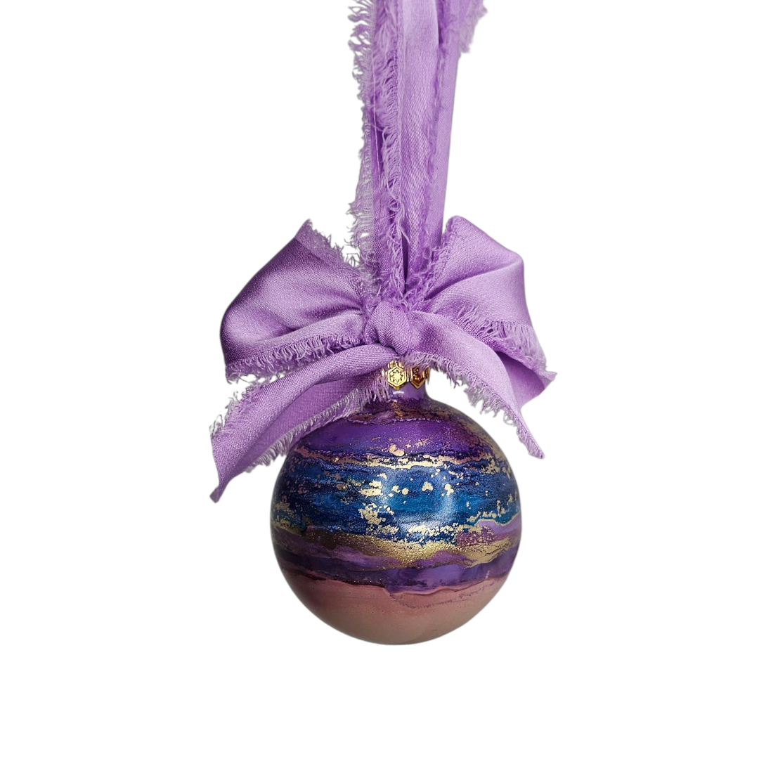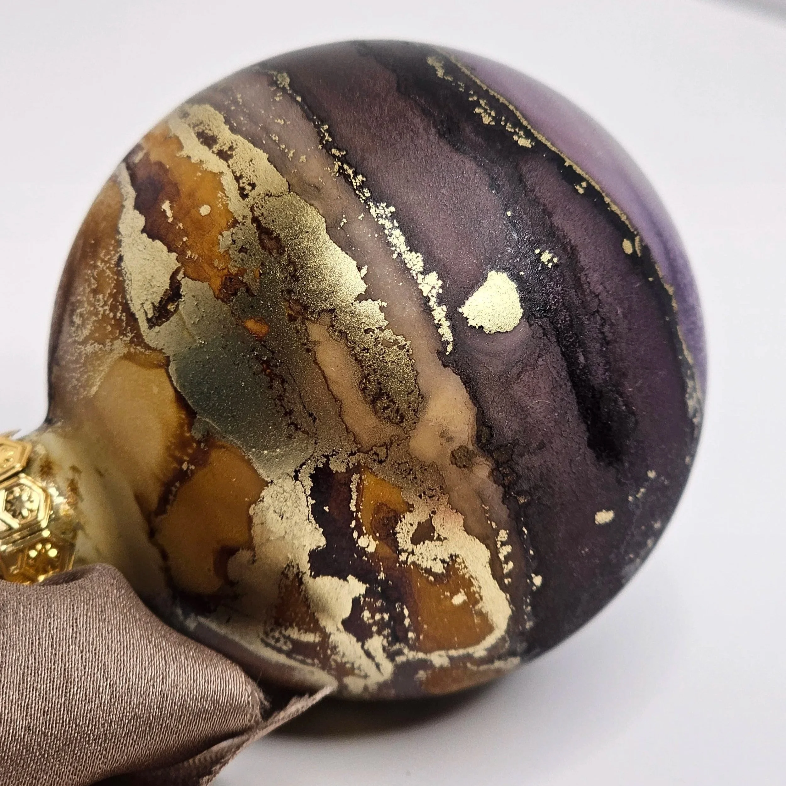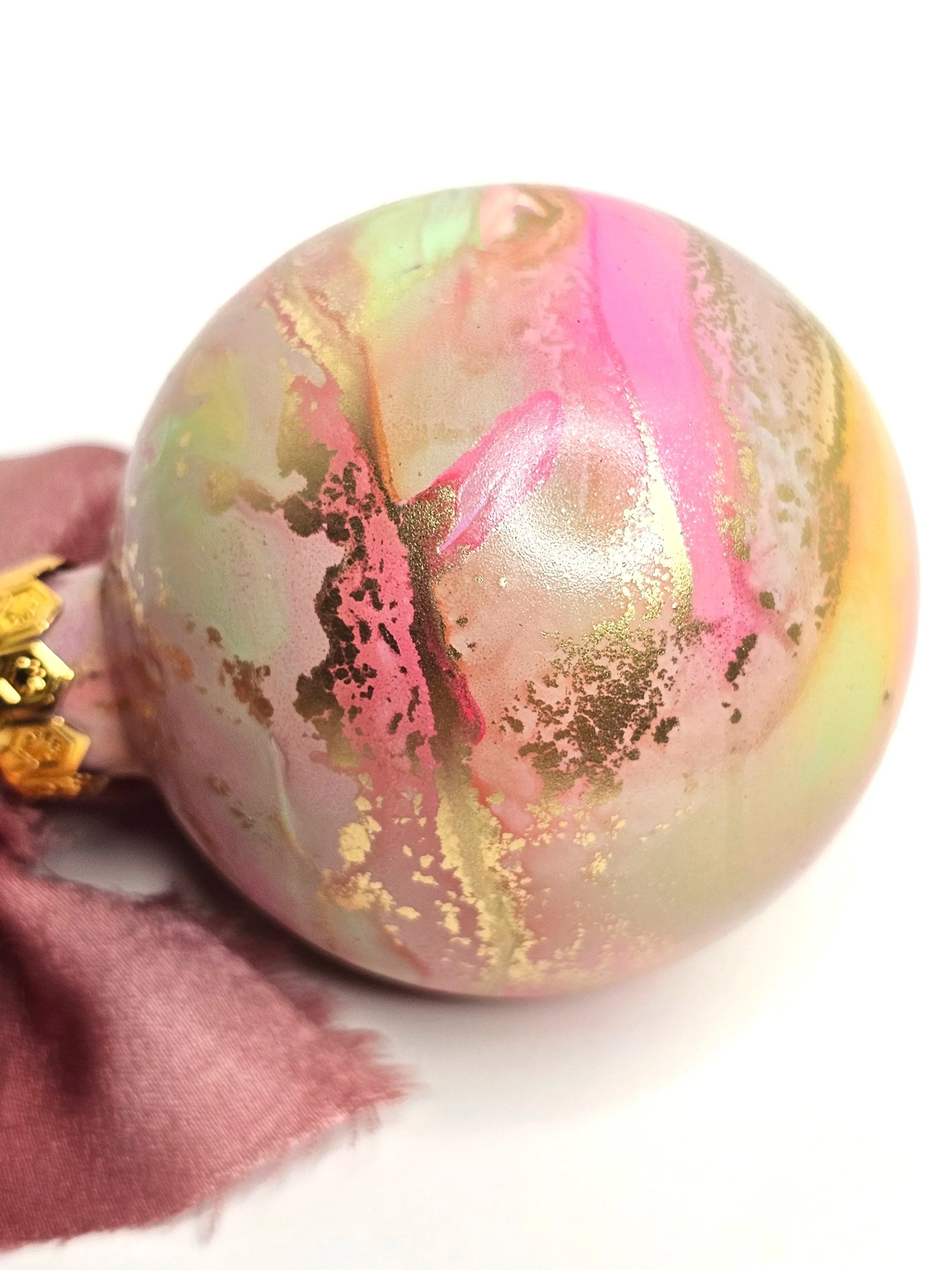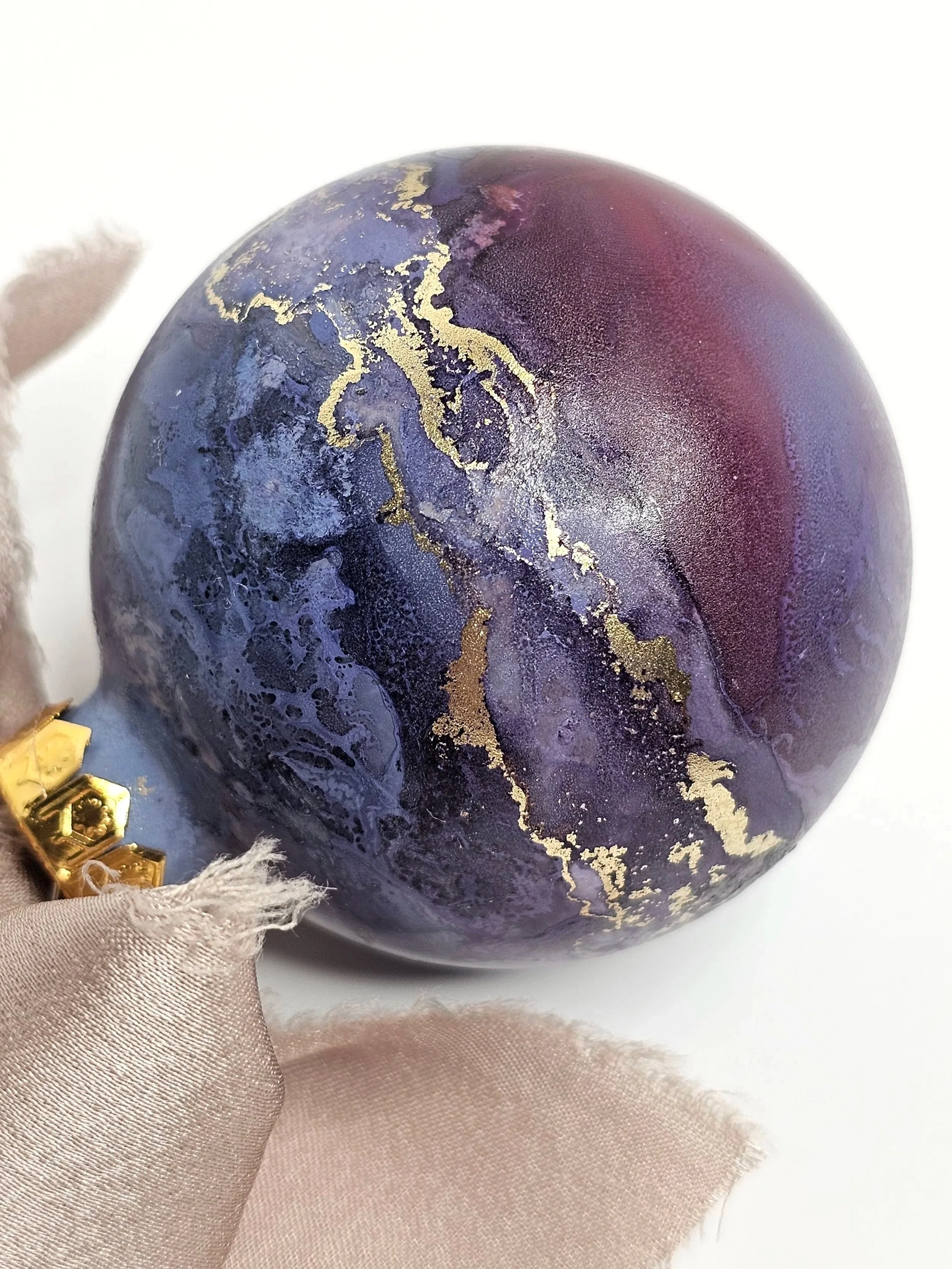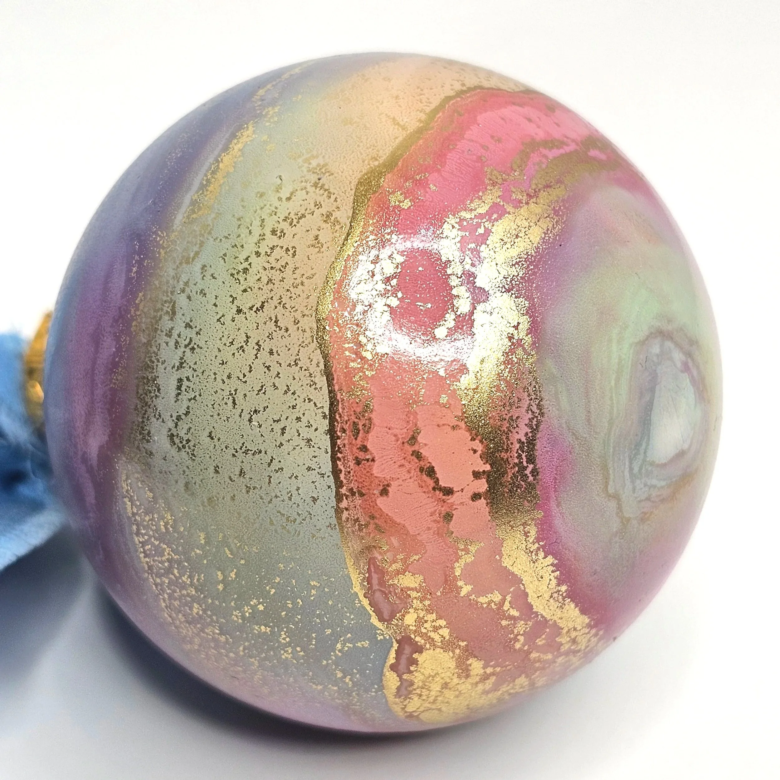 • Each 60mm glass ornament is a unique piece of art, hand-painted using vibrant abstract alcohol inks. They feature a gold cap and comes complete with a hand-tied satin ribbon, ready for display.