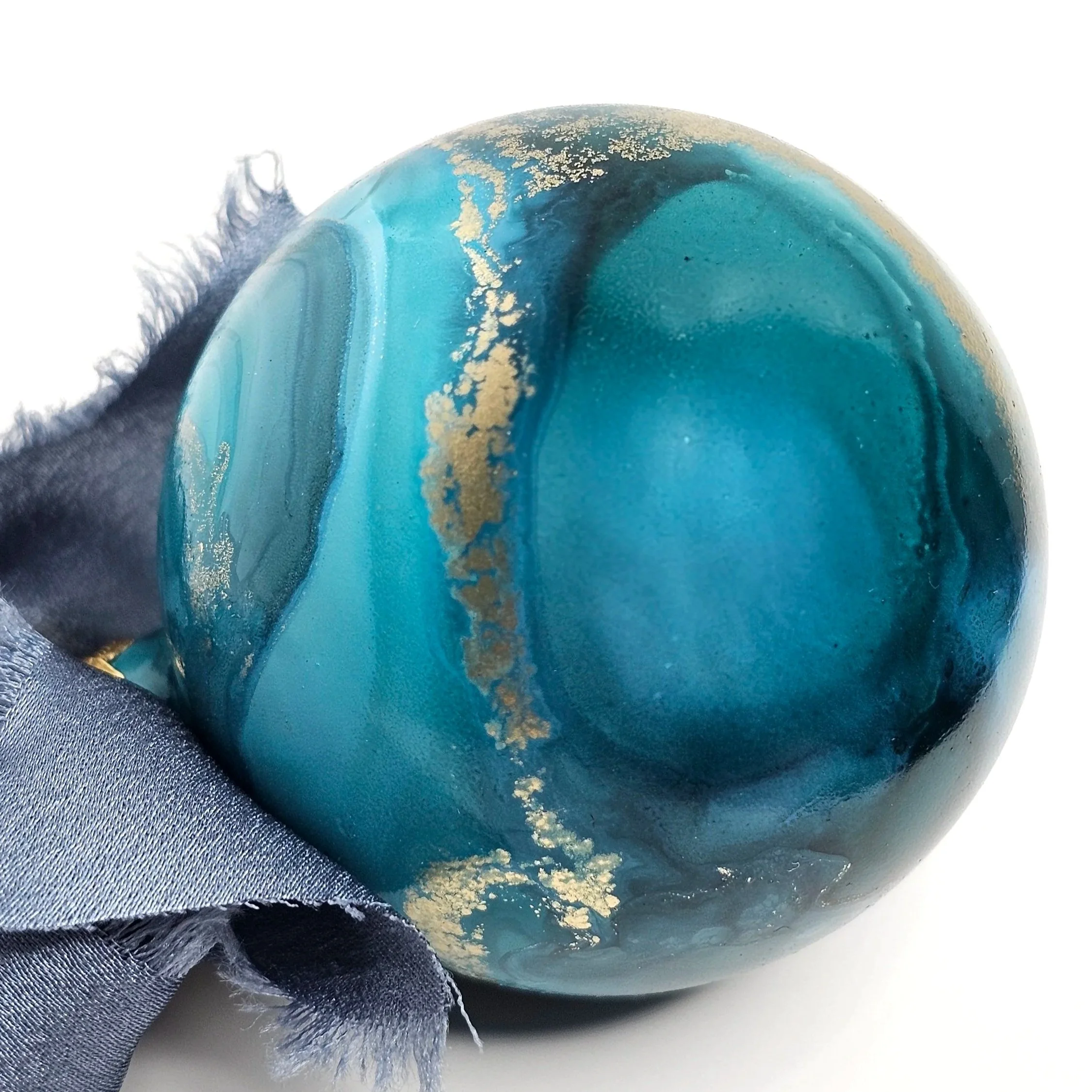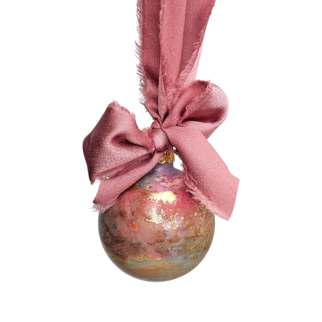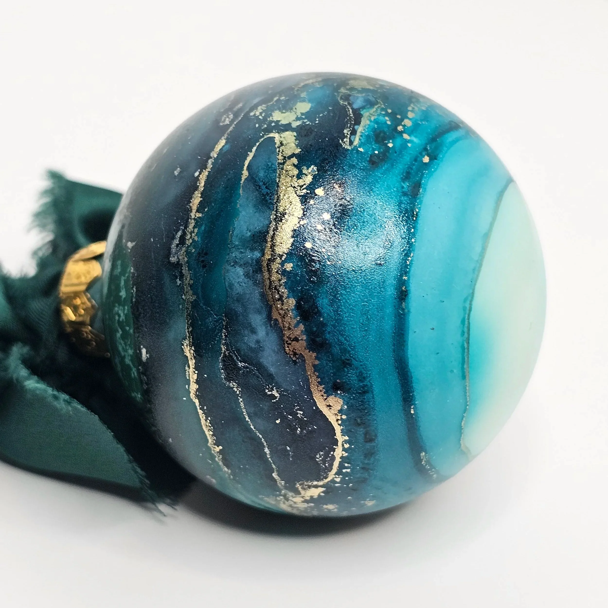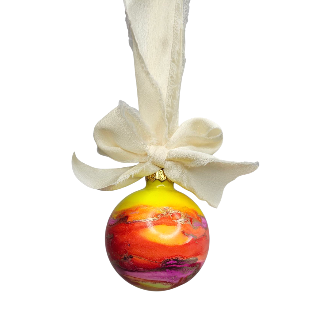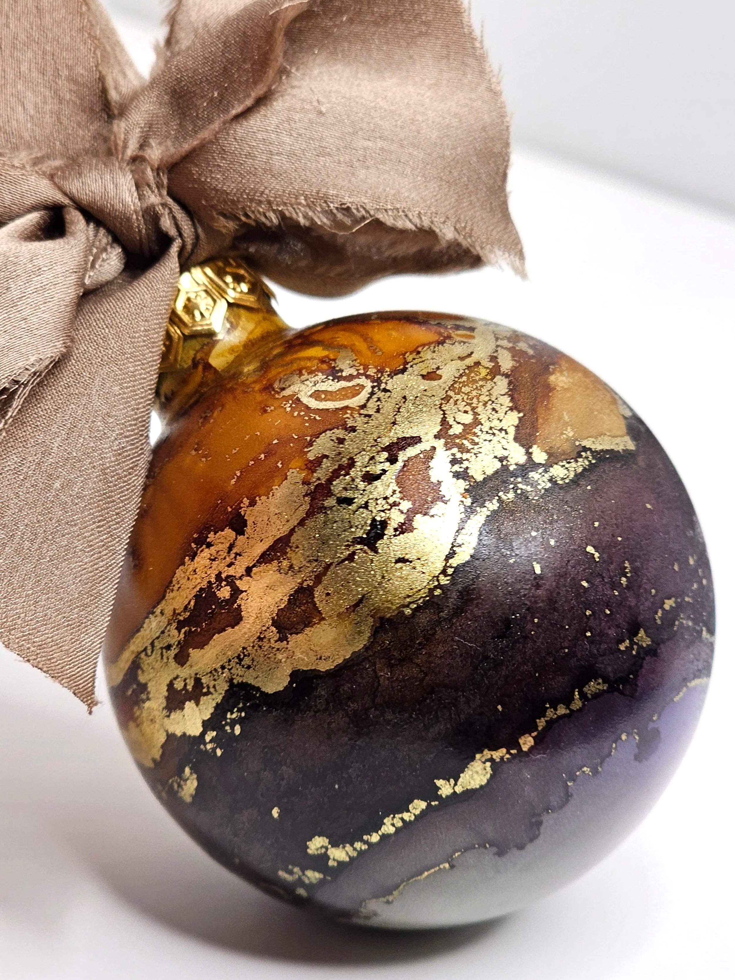 • Each 60mm glass ornament is a unique piece of art, hand-painted using vibrant abstract alcohol inks. They feature a gold cap and comes complete with a hand-tied satin ribbon, ready for display.