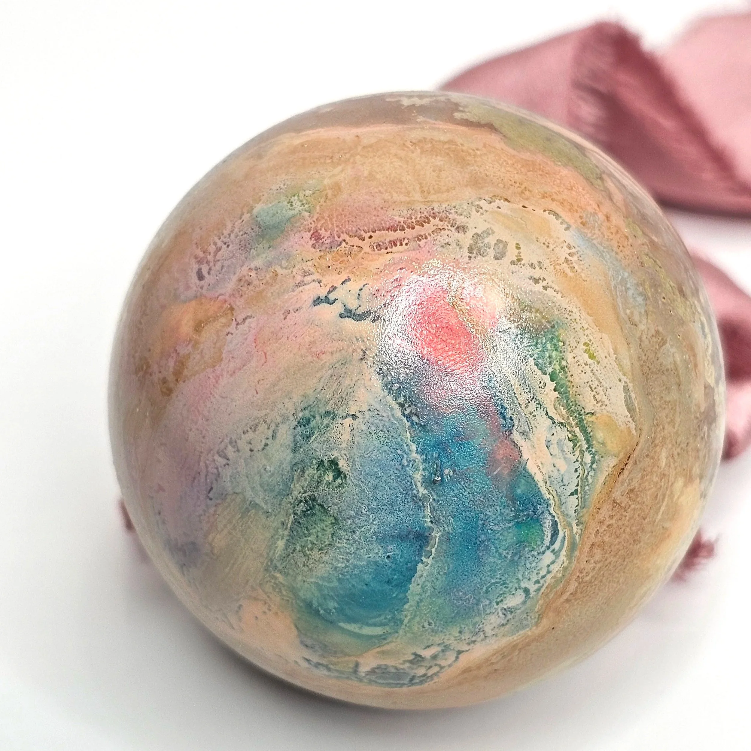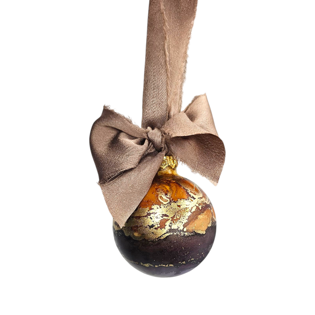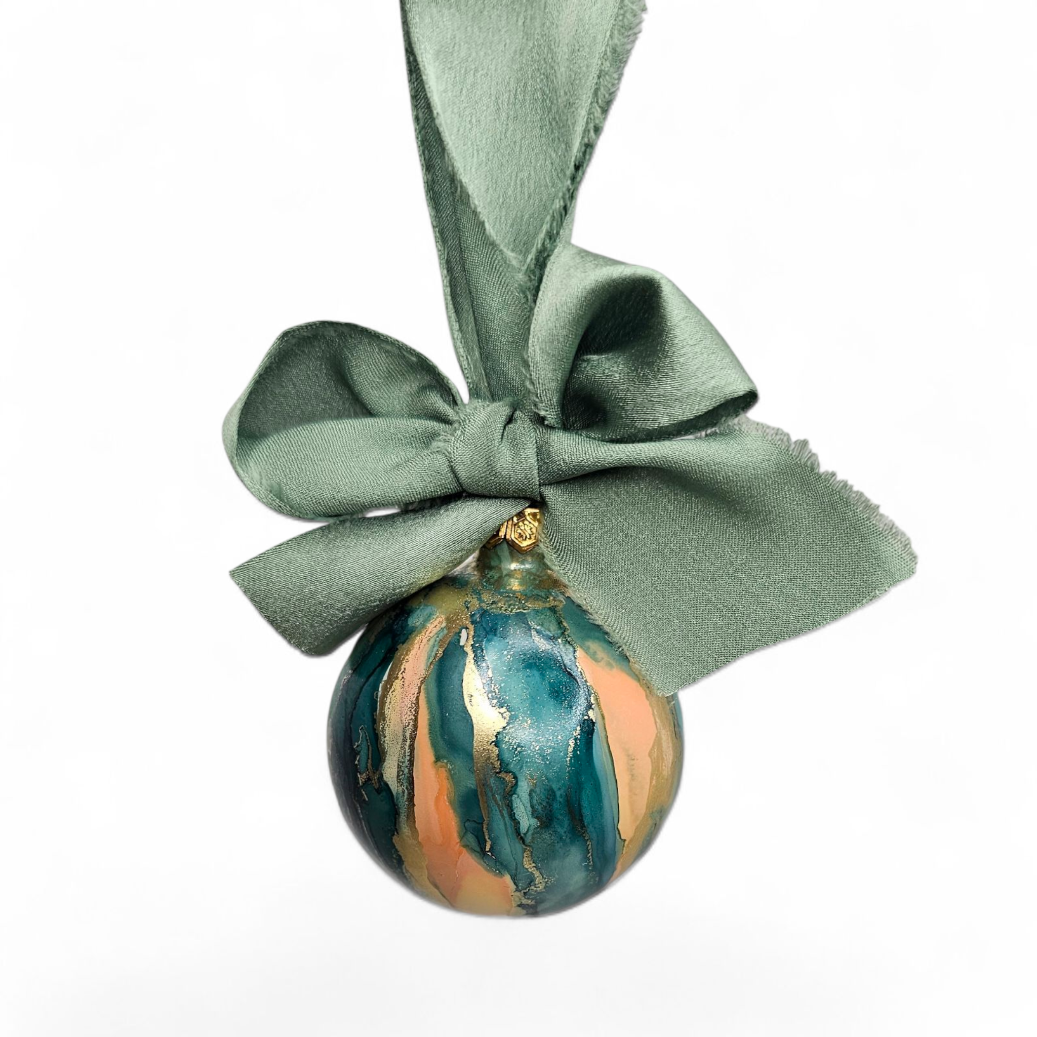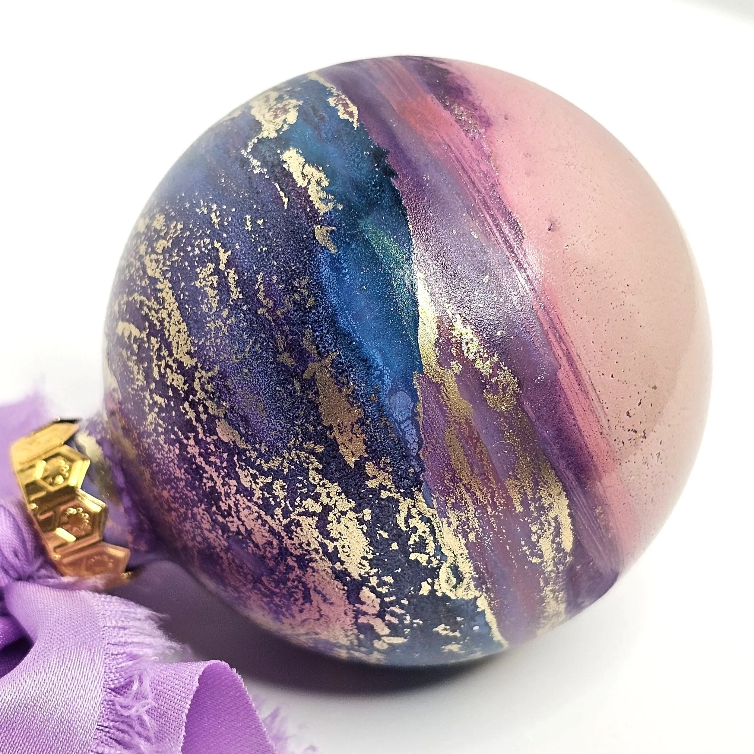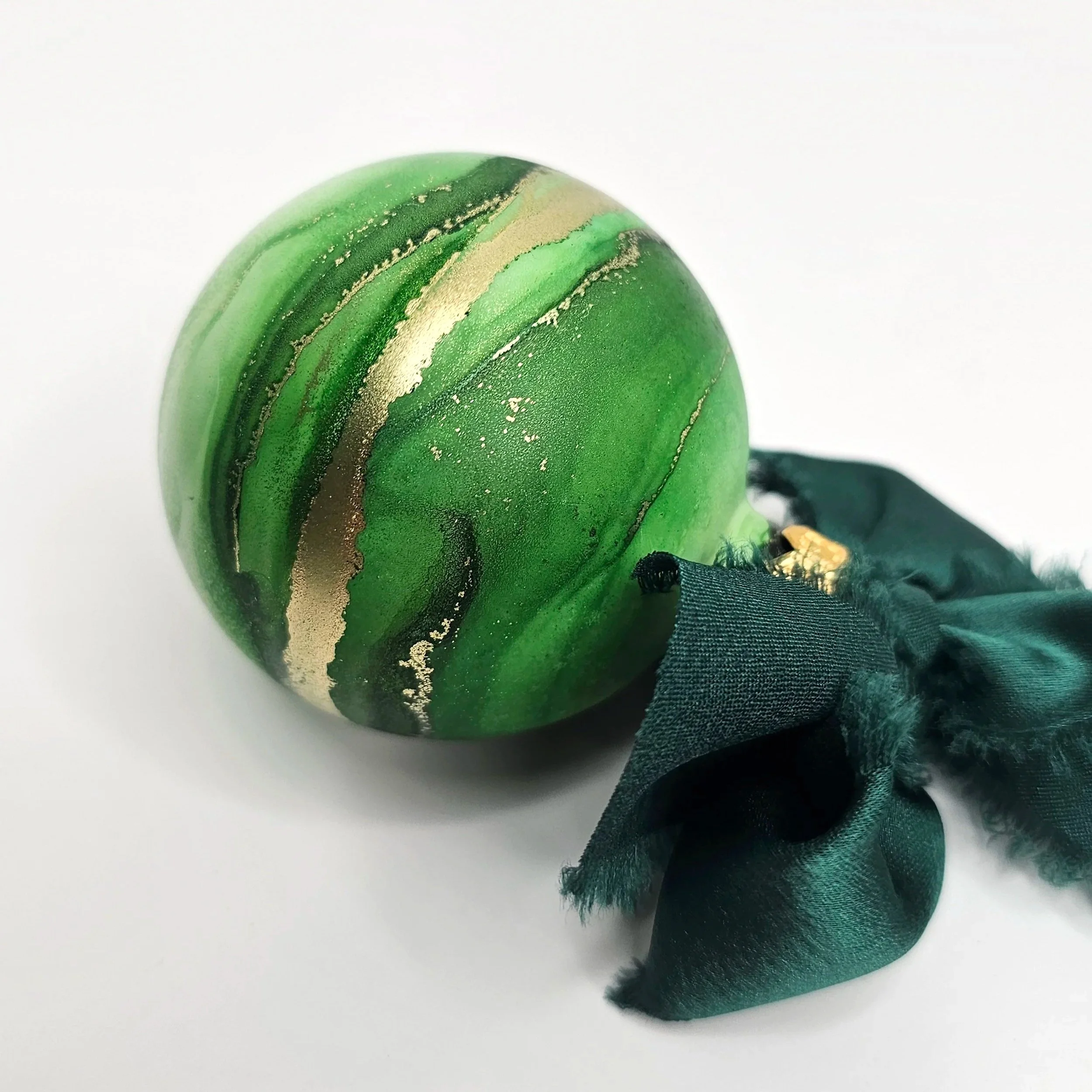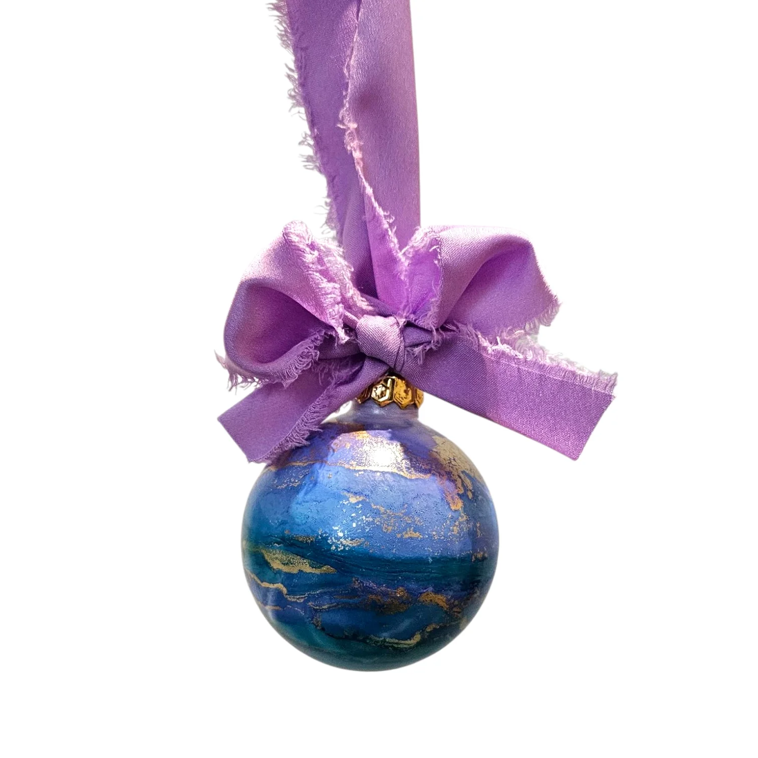 • Each 60mm glass ornament is a unique piece of art, hand-painted using vibrant abstract alcohol inks. They feature a gold cap and comes complete with a hand-tied satin ribbon, ready for display.