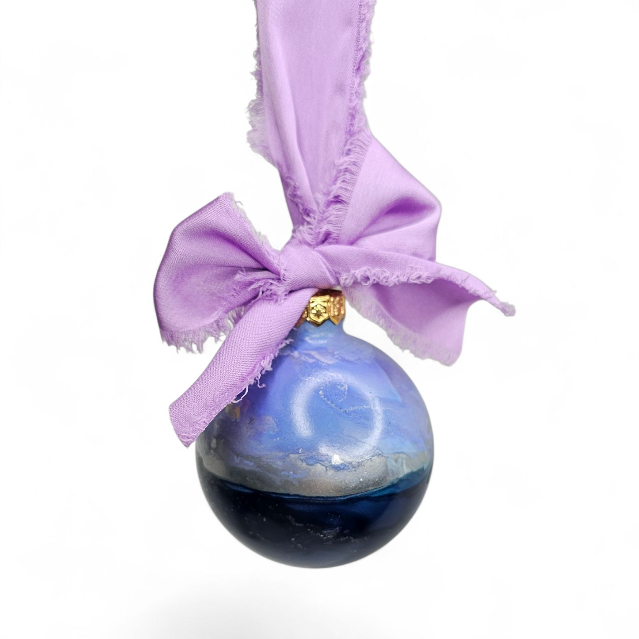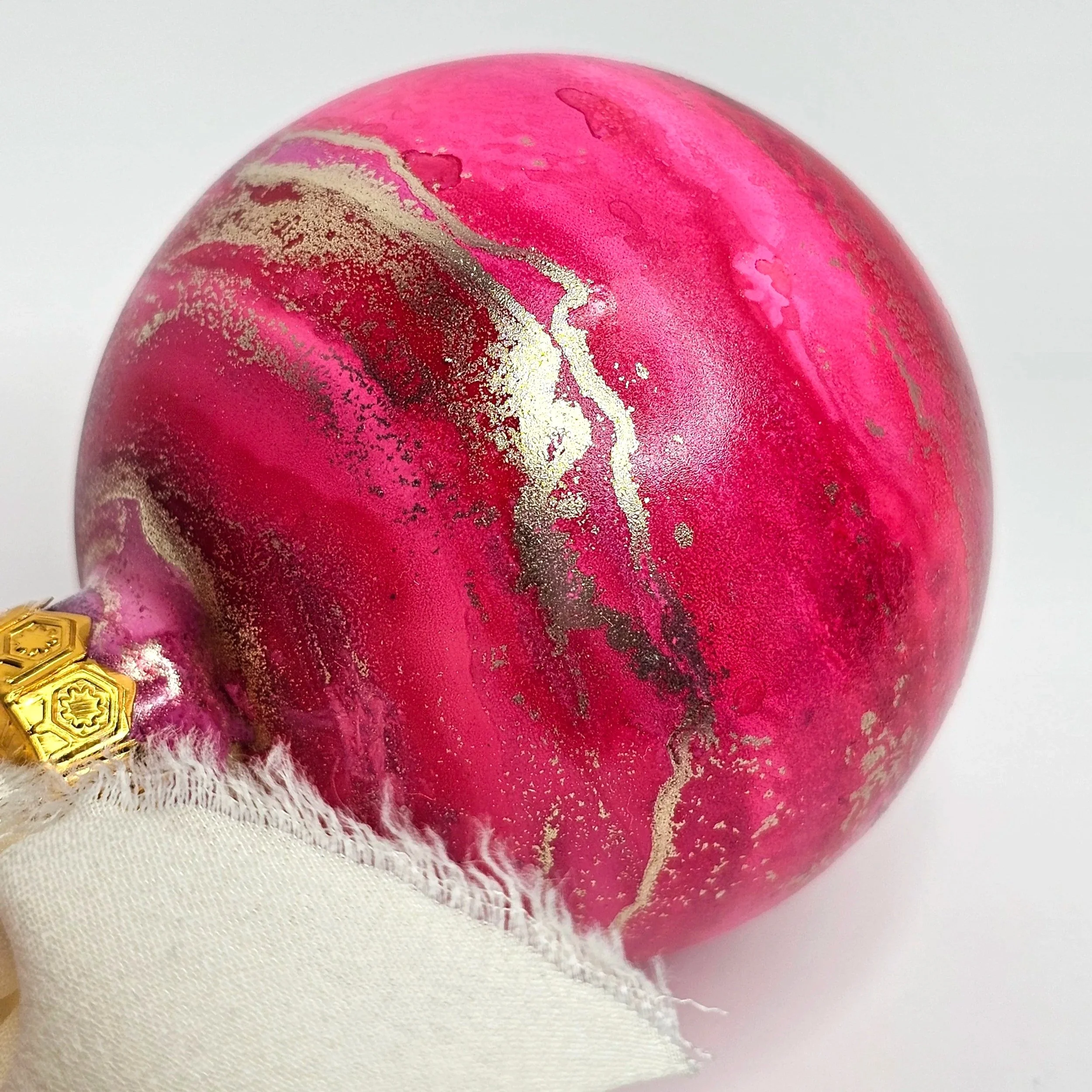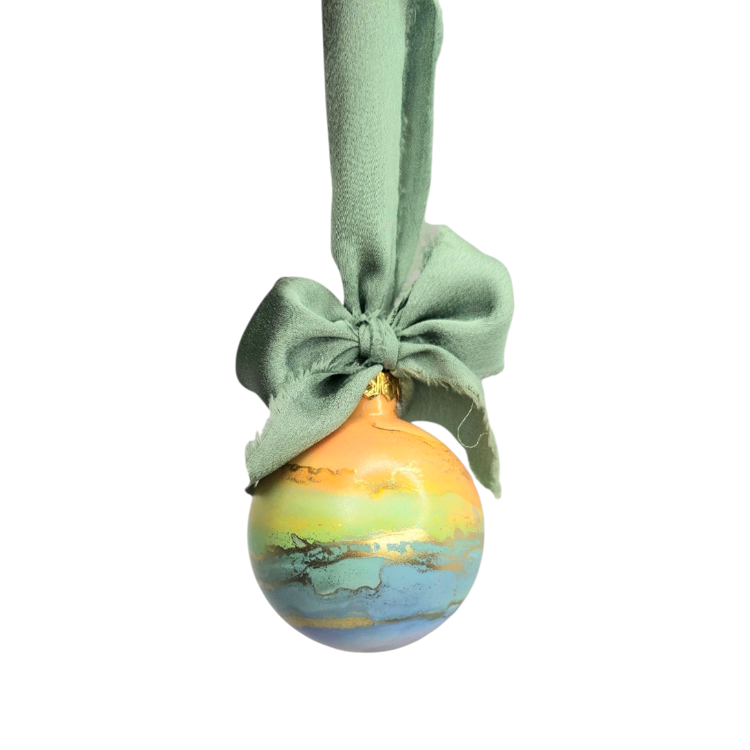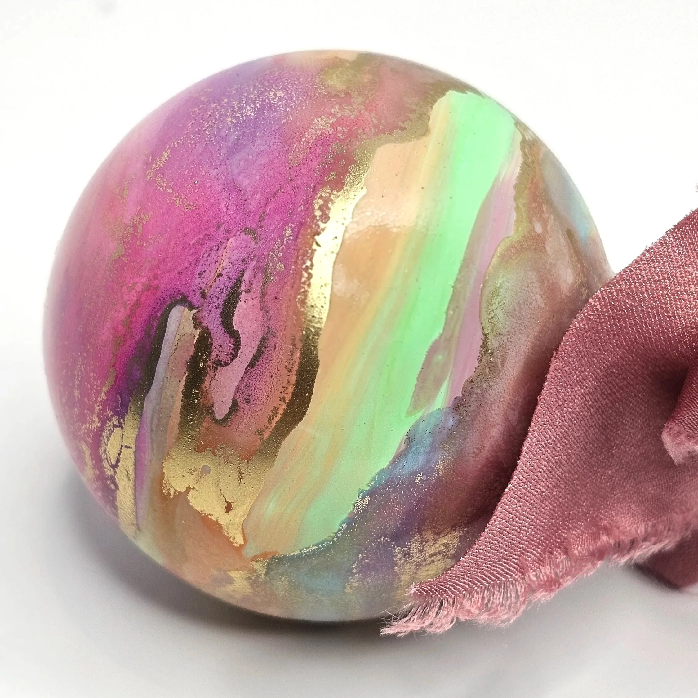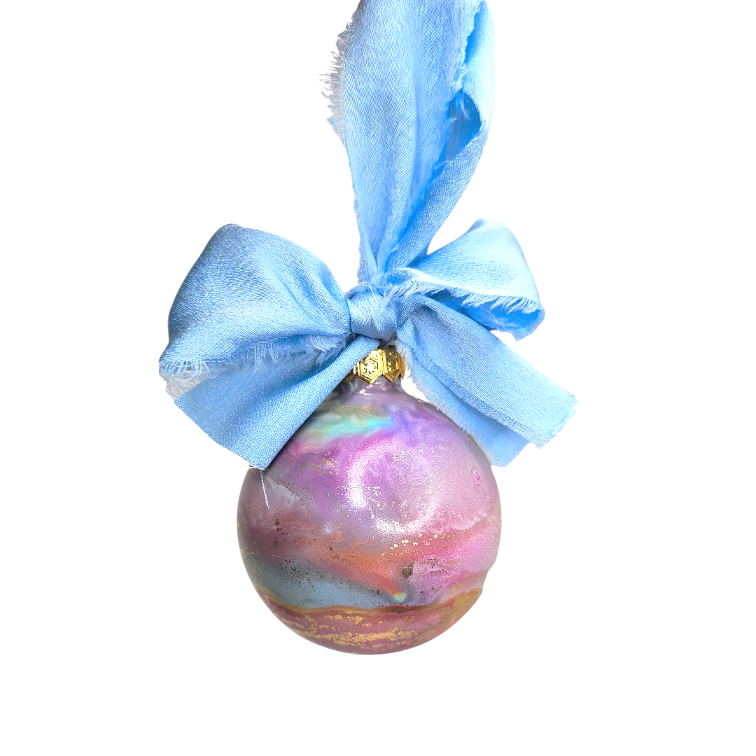• Each 60mm glass ornament is a unique piece of art, hand-painted using vibrant abstract alcohol inks. They feature a gold cap and comes complete with a hand-tied satin ribbon, ready for display.