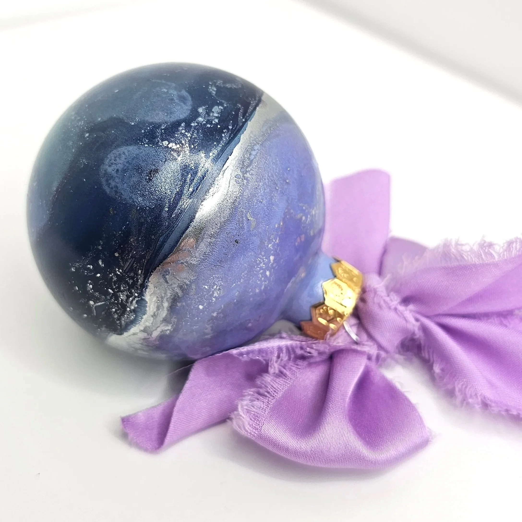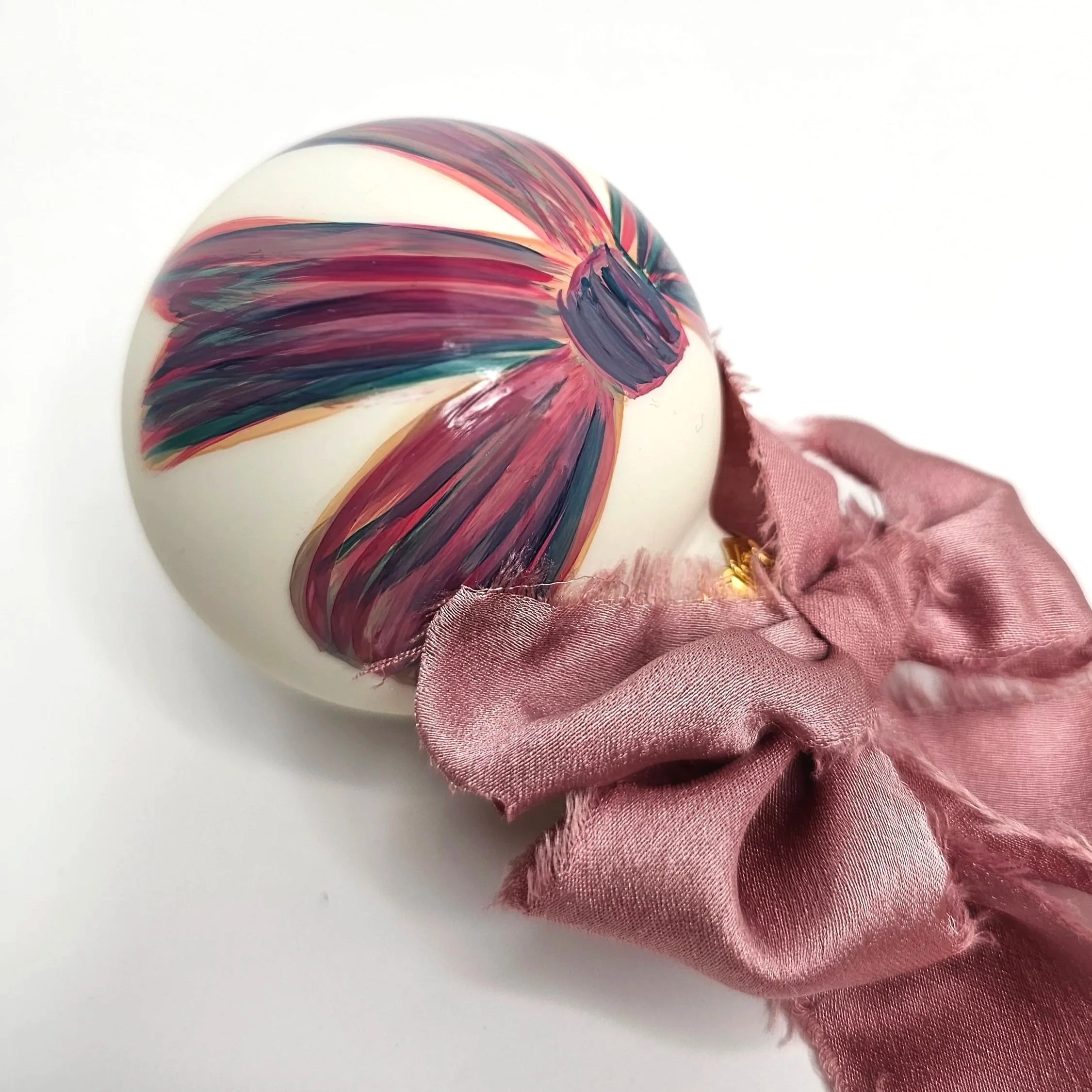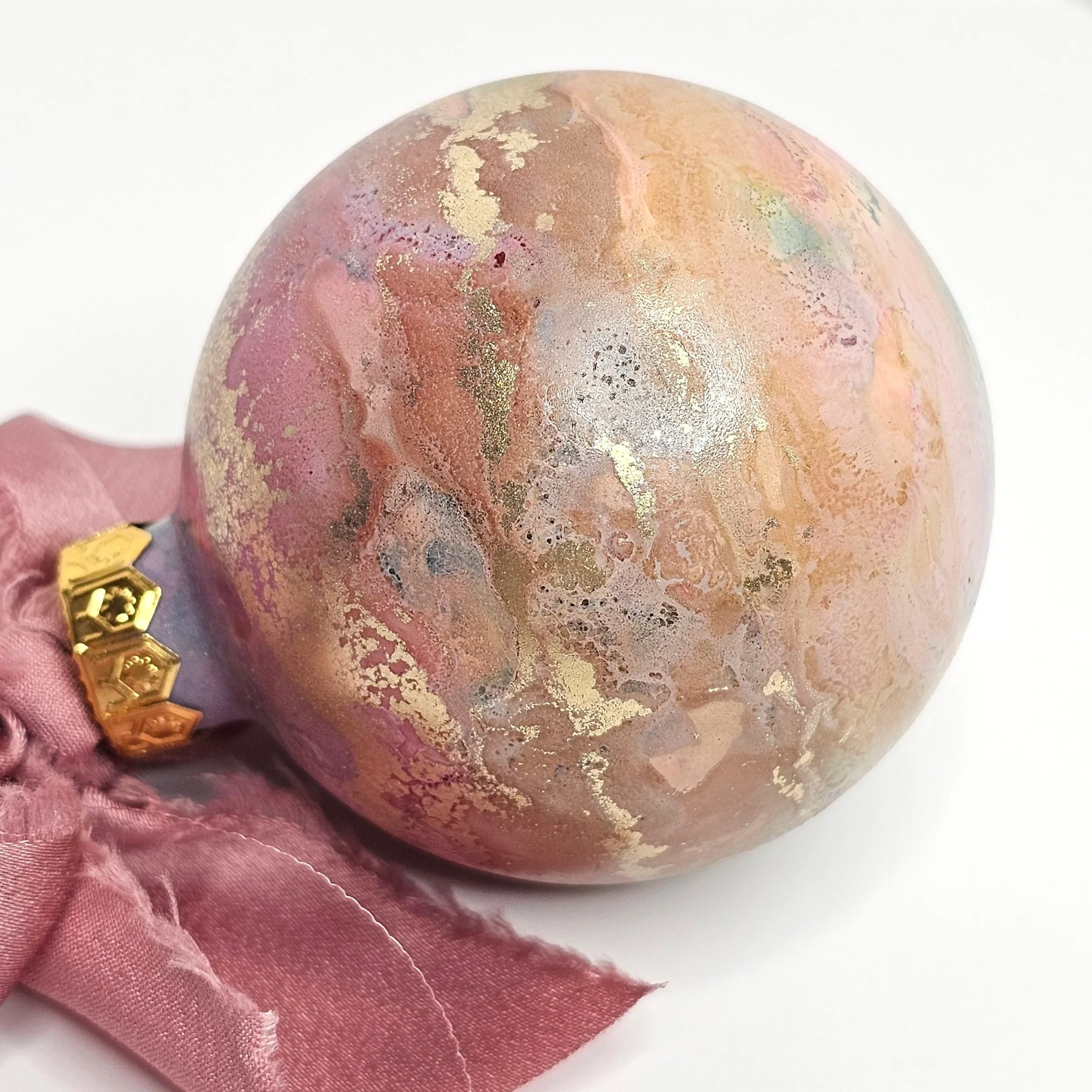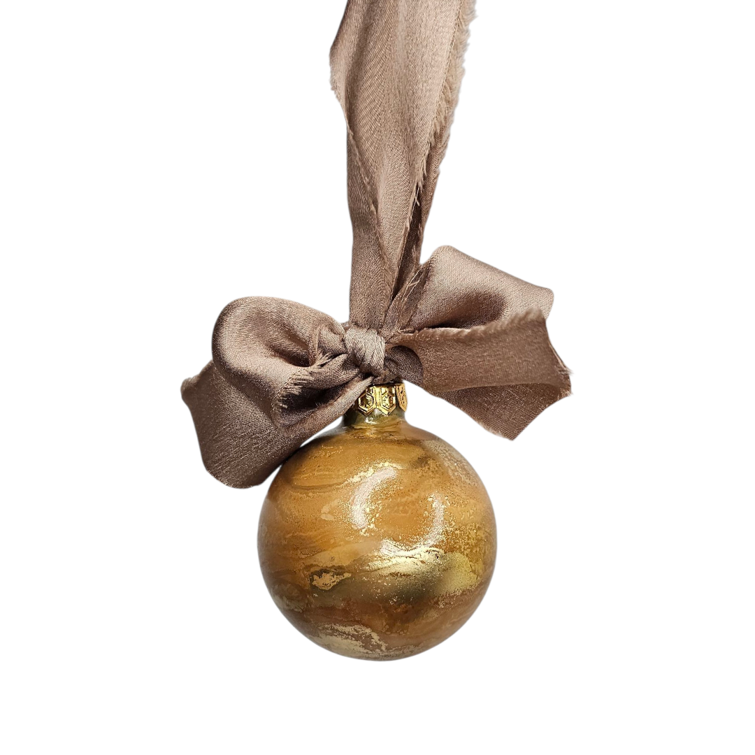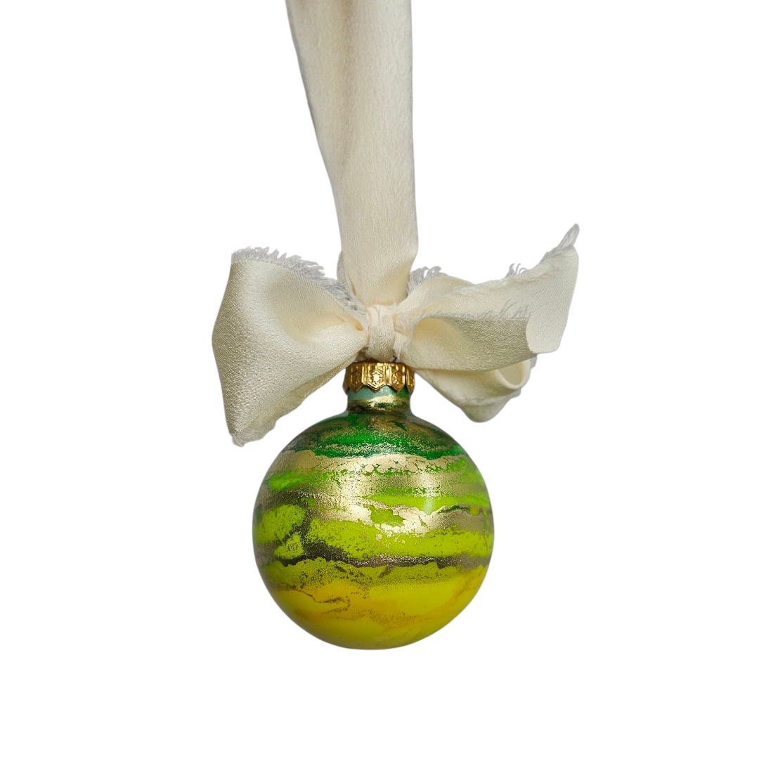 • Each 60mm glass ornament is a unique piece of art, hand-painted using vibrant abstract alcohol inks. They feature a gold cap and comes complete with a hand-tied satin ribbon, ready for display.