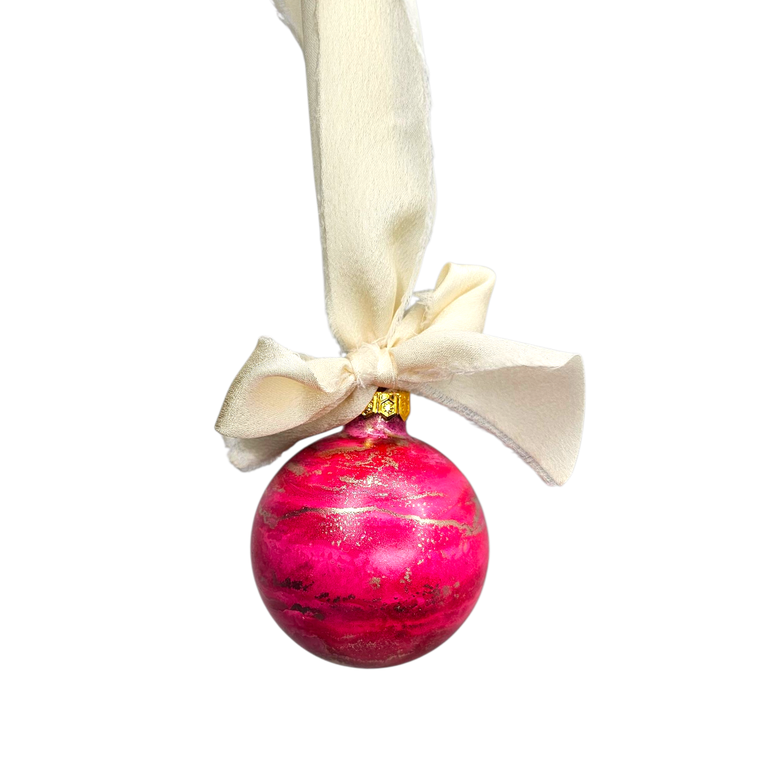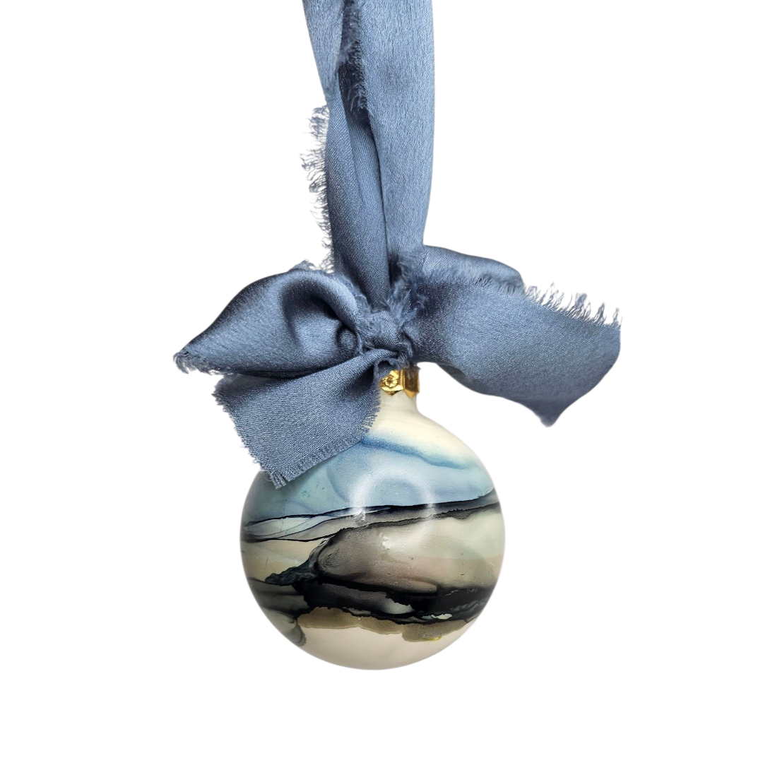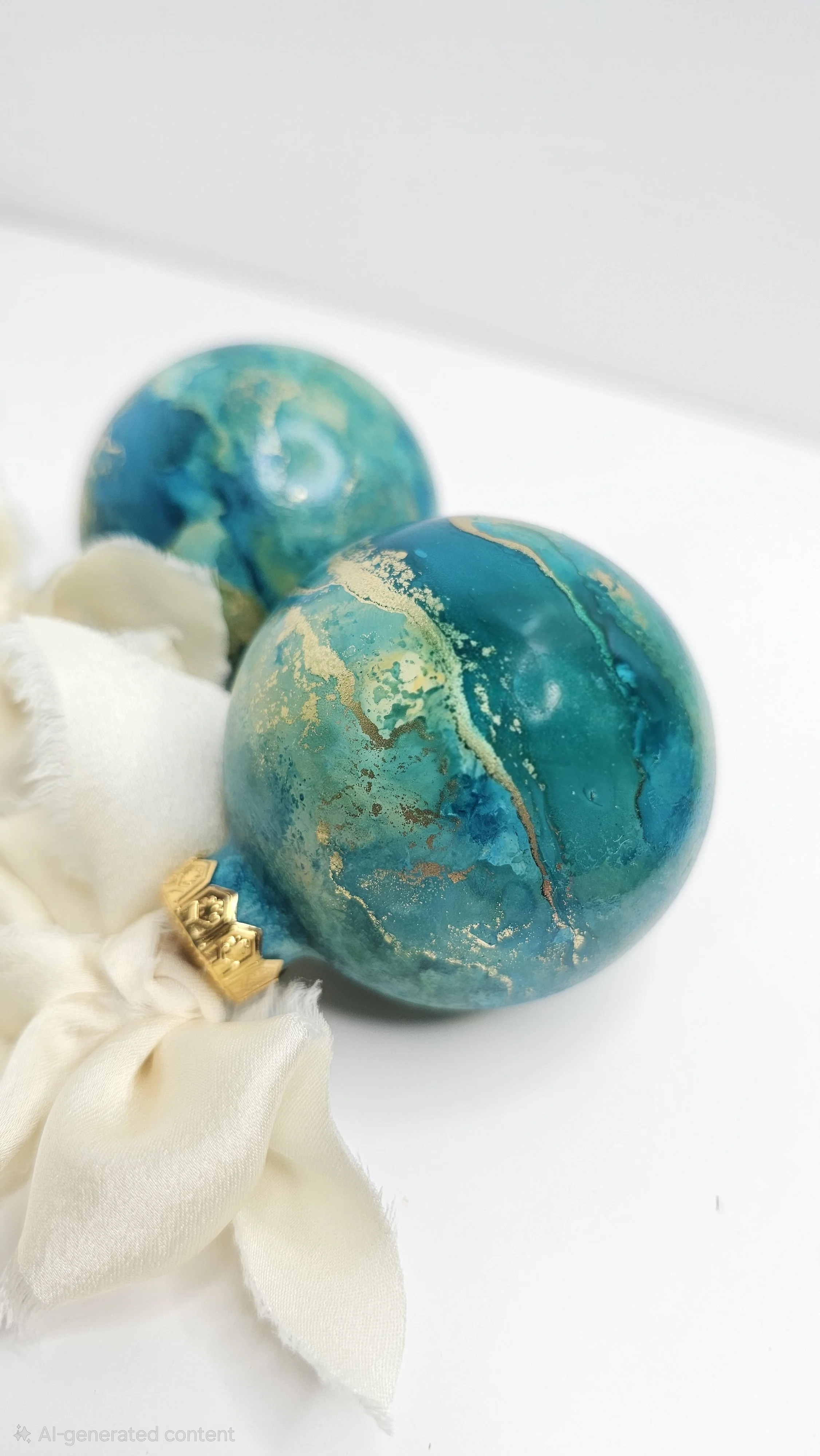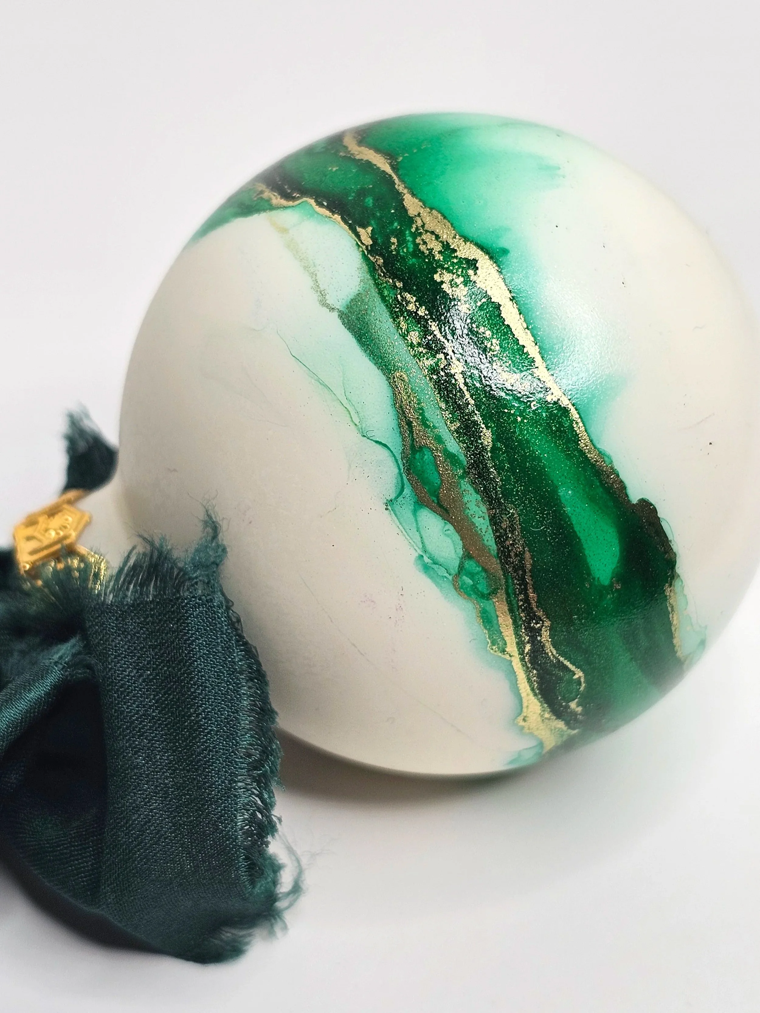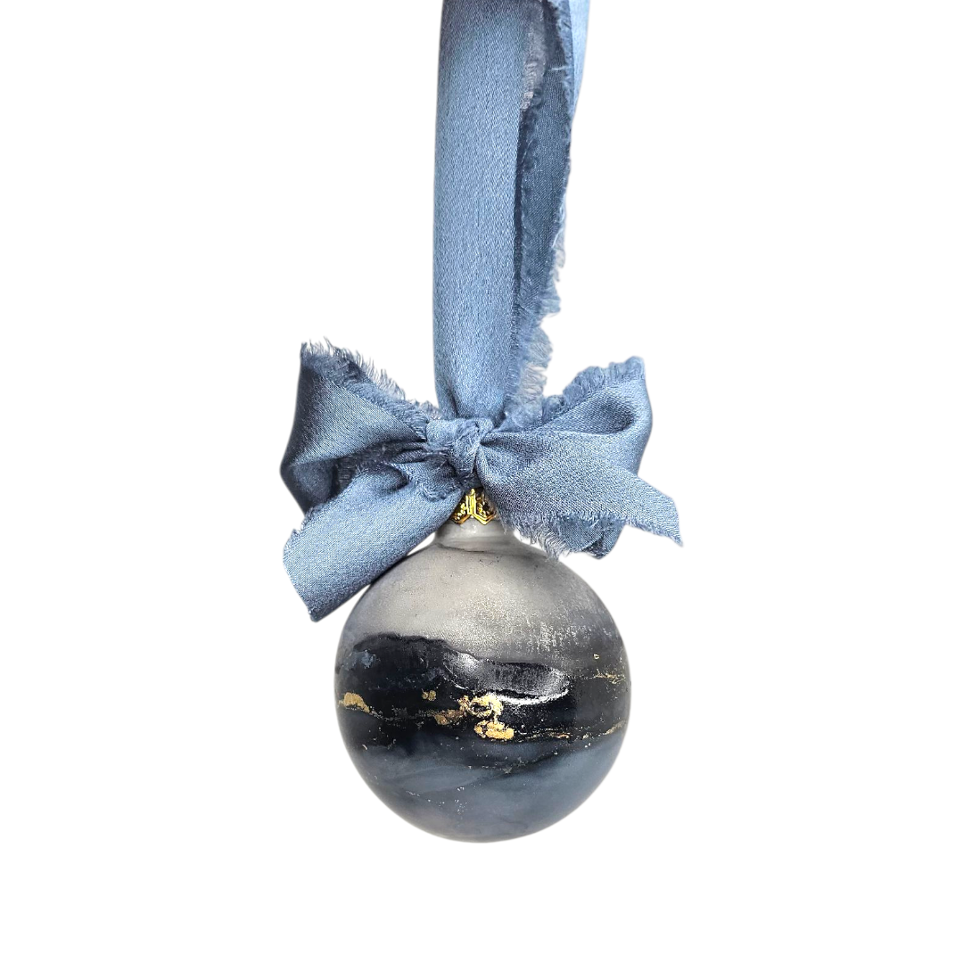 • Each 60mm glass ornament is a unique piece of art, hand-painted using vibrant abstract alcohol inks. They feature a gold cap and comes complete with a hand-tied satin ribbon, ready for display.