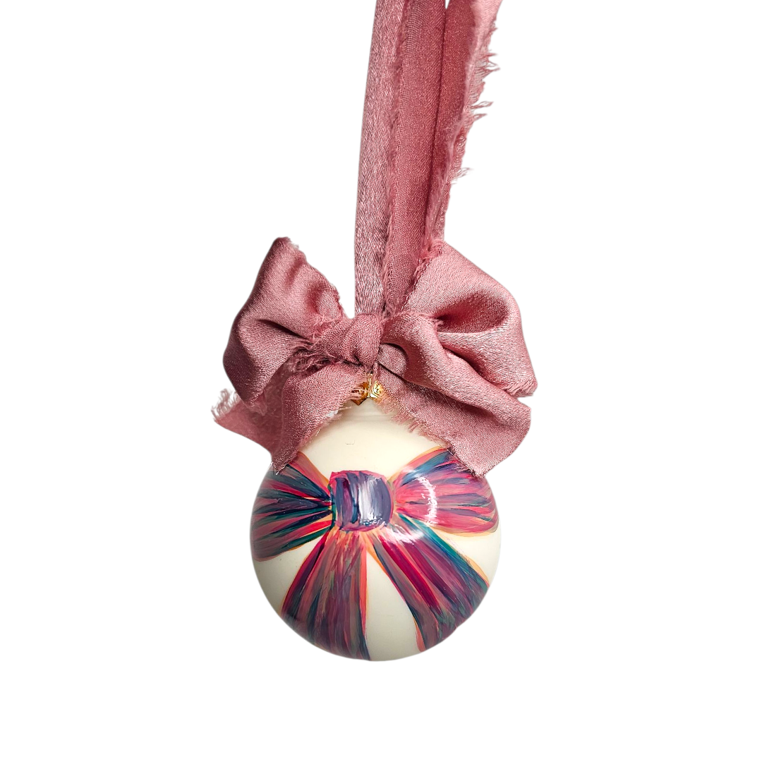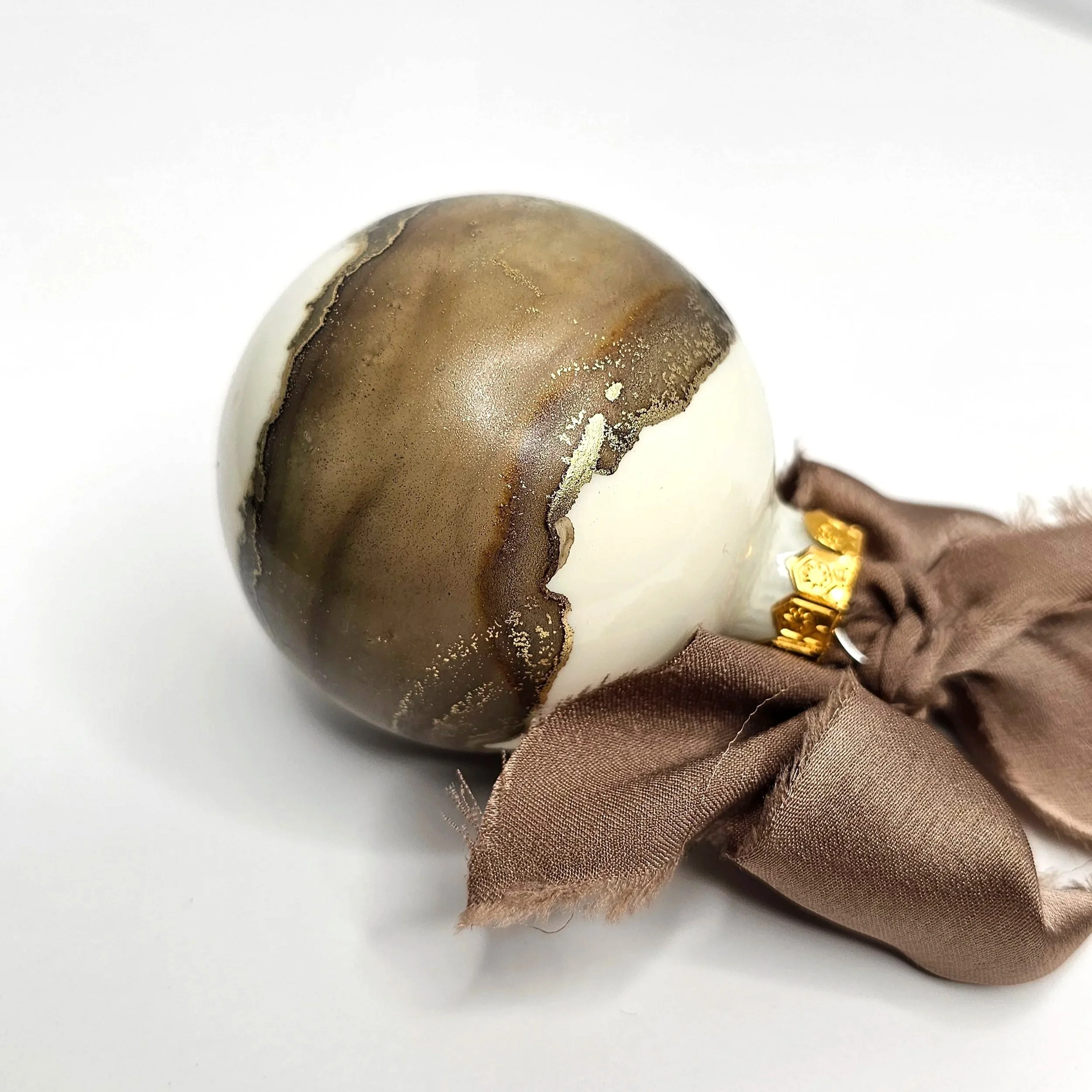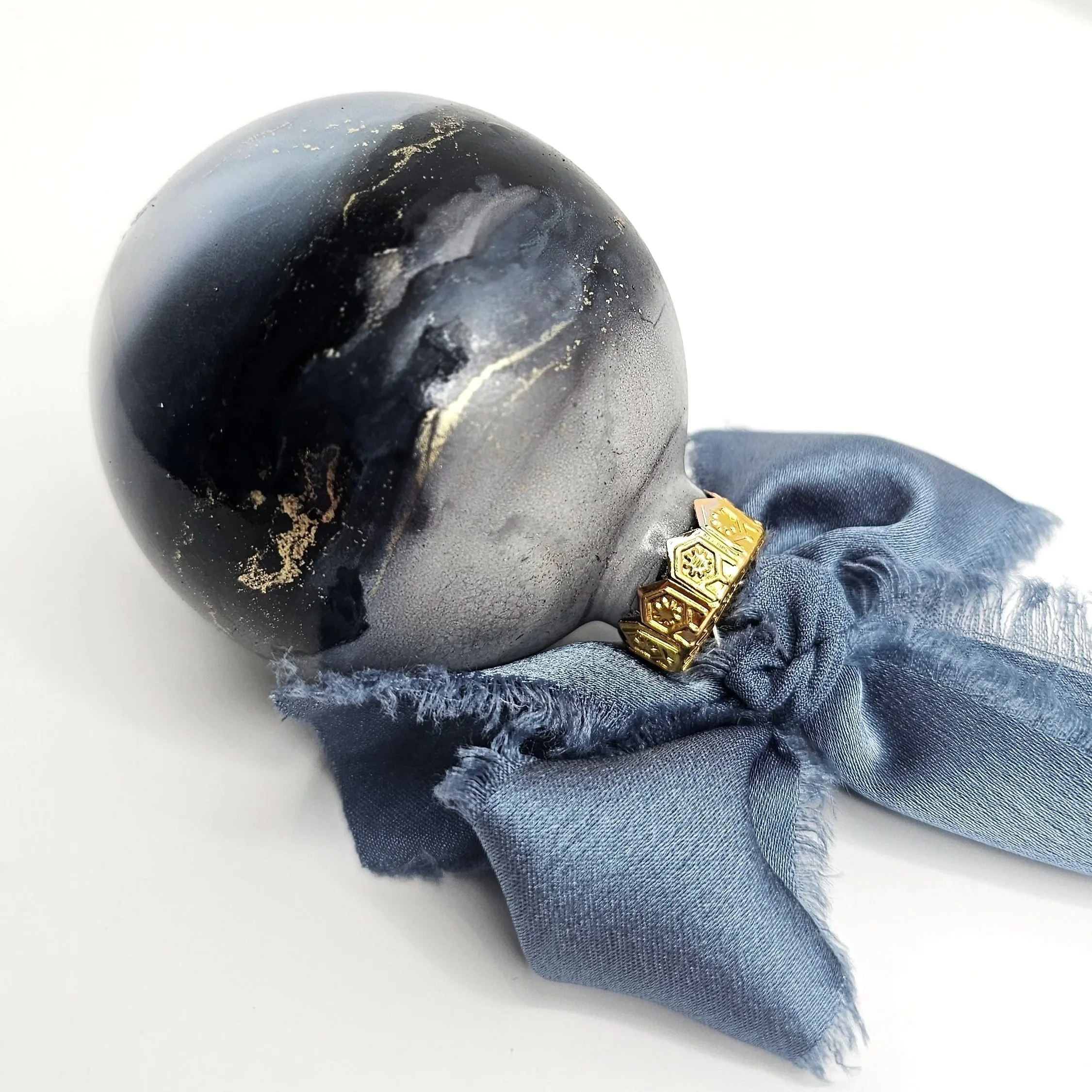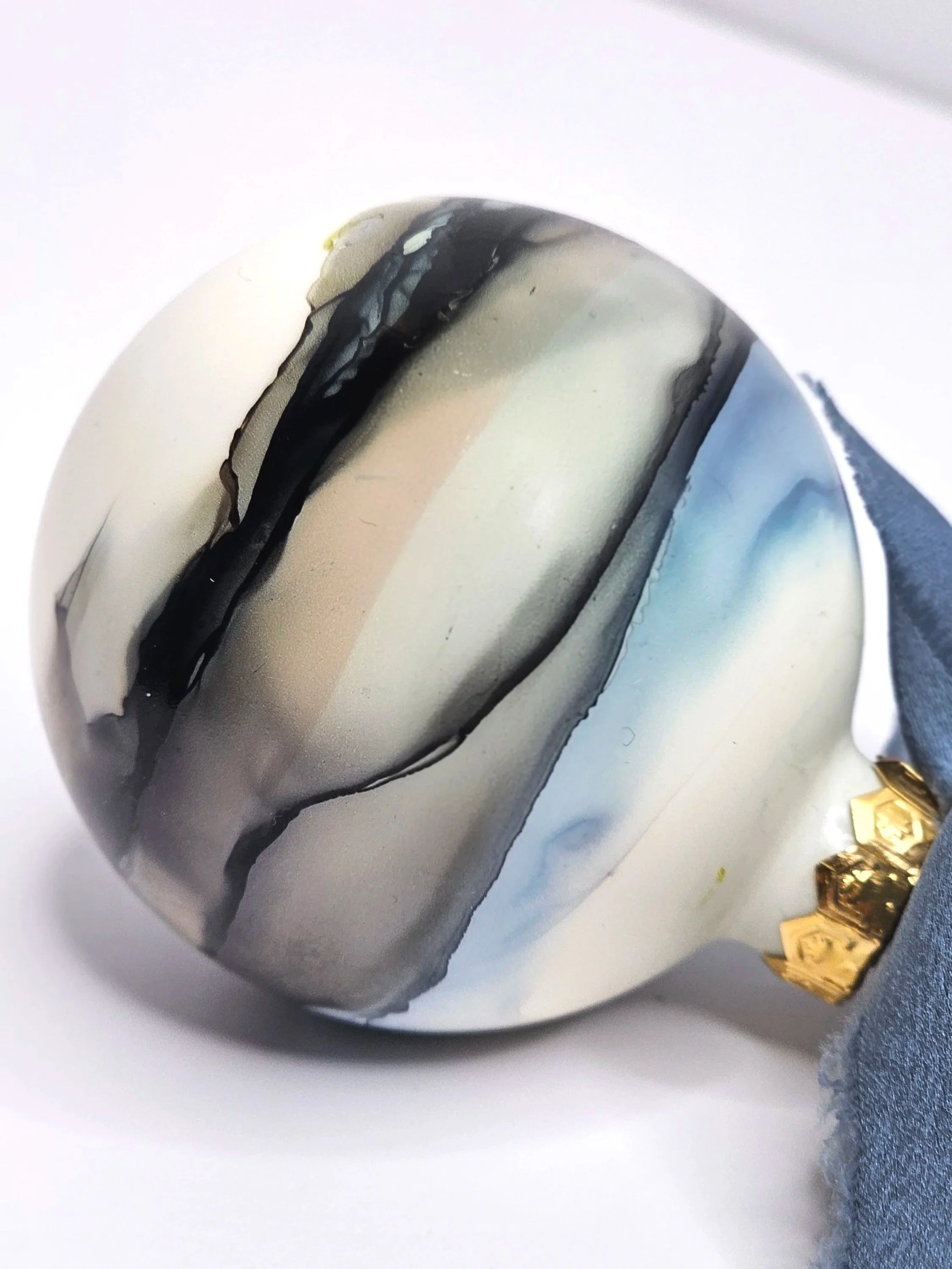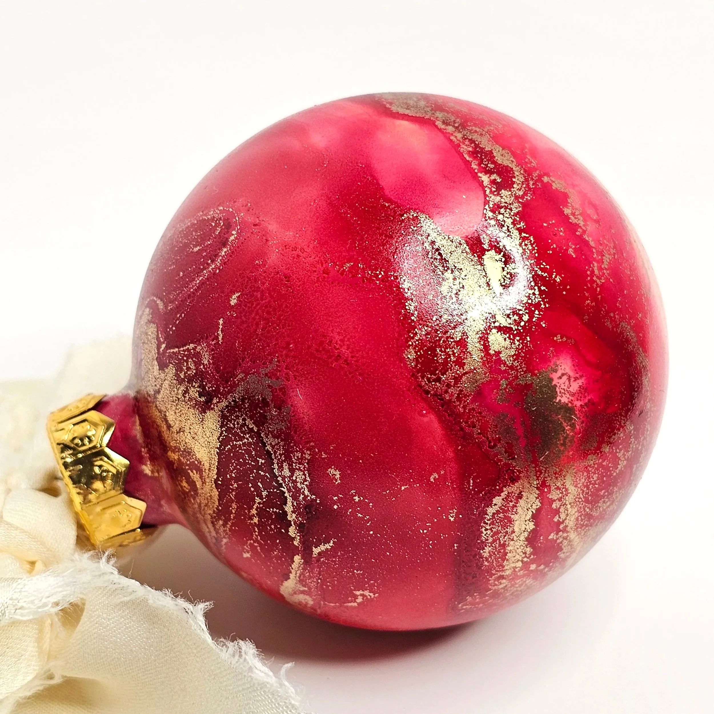 • Each 60mm glass ornament is a unique piece of art, hand-painted using vibrant abstract alcohol inks. They feature a gold cap and comes complete with a hand-tied satin ribbon, ready for display.