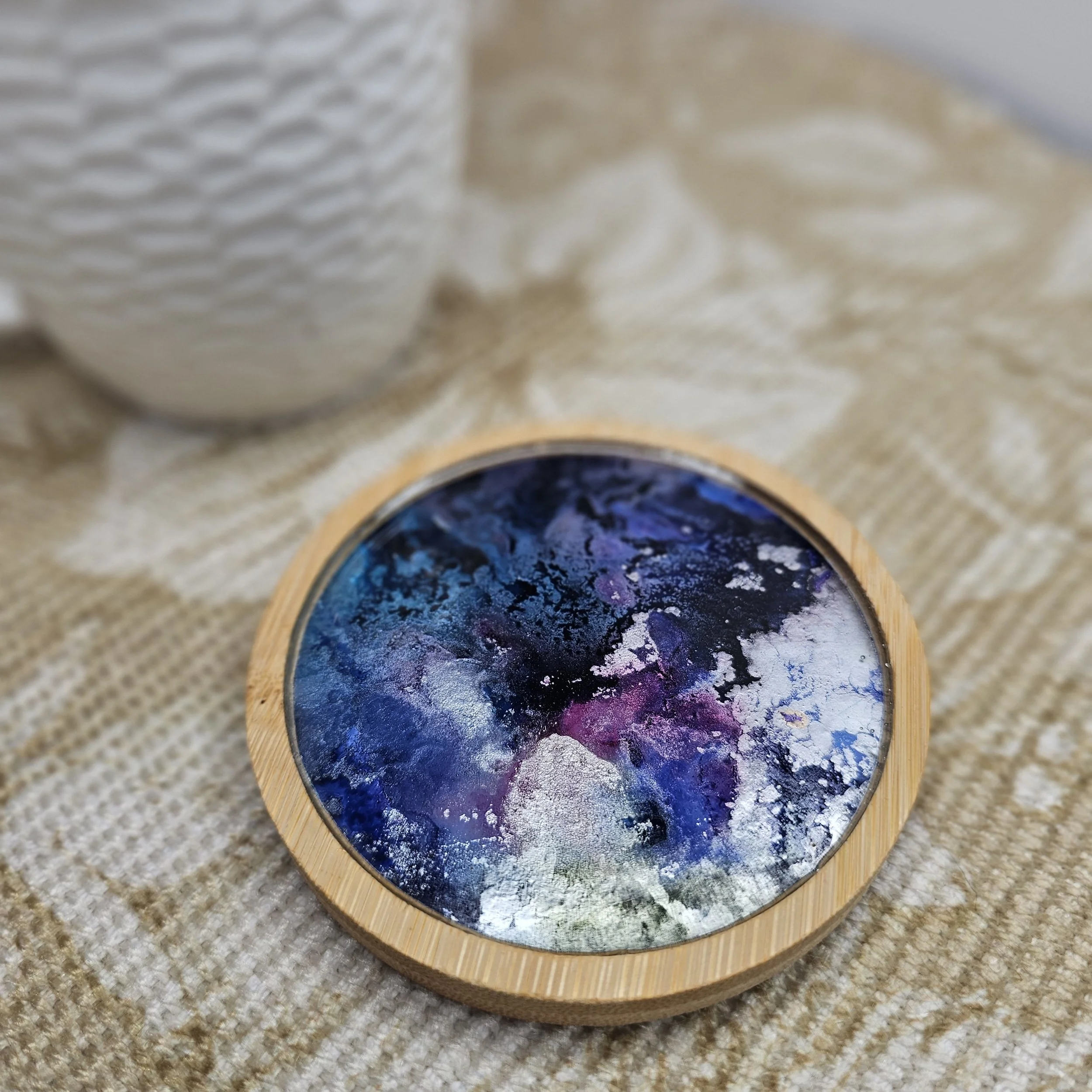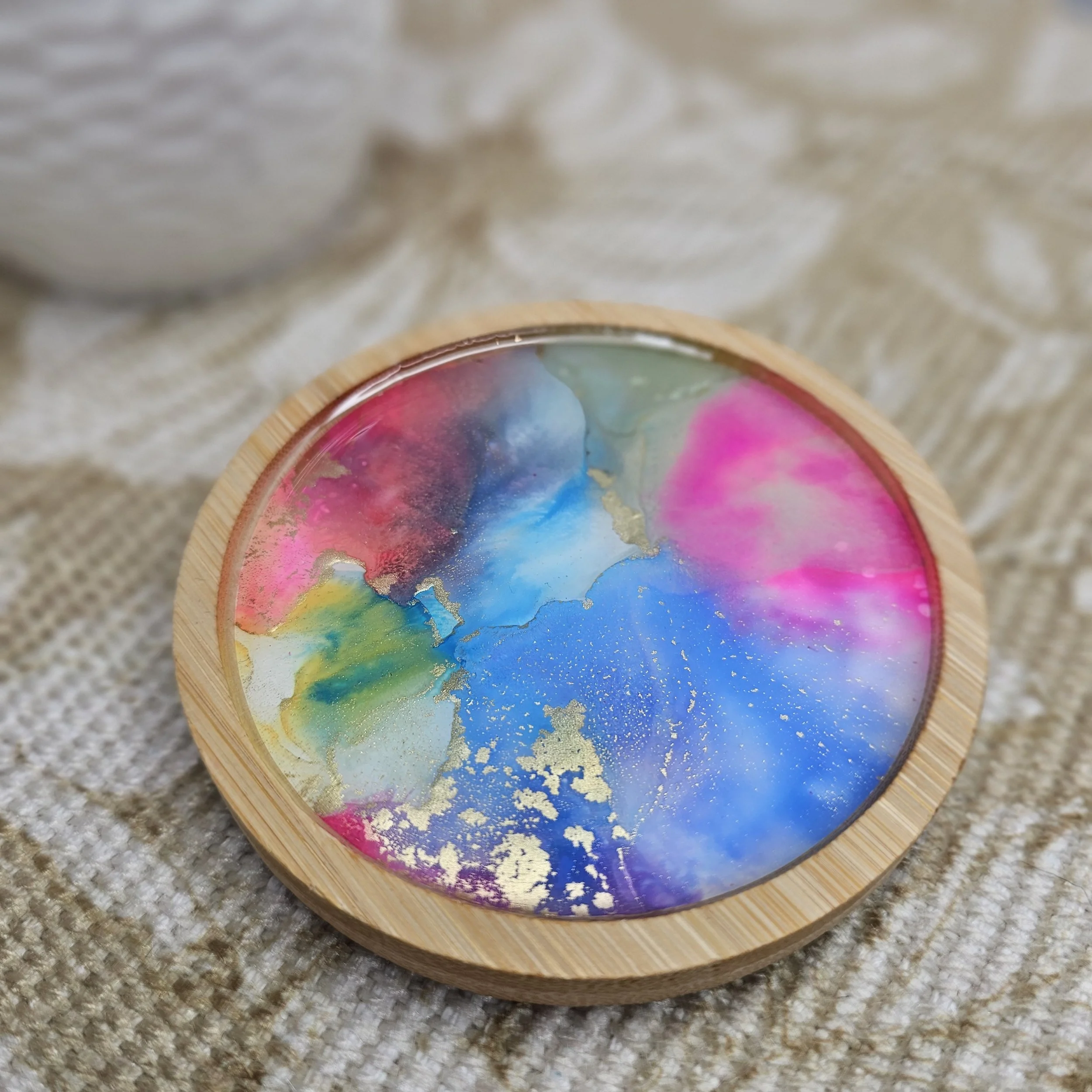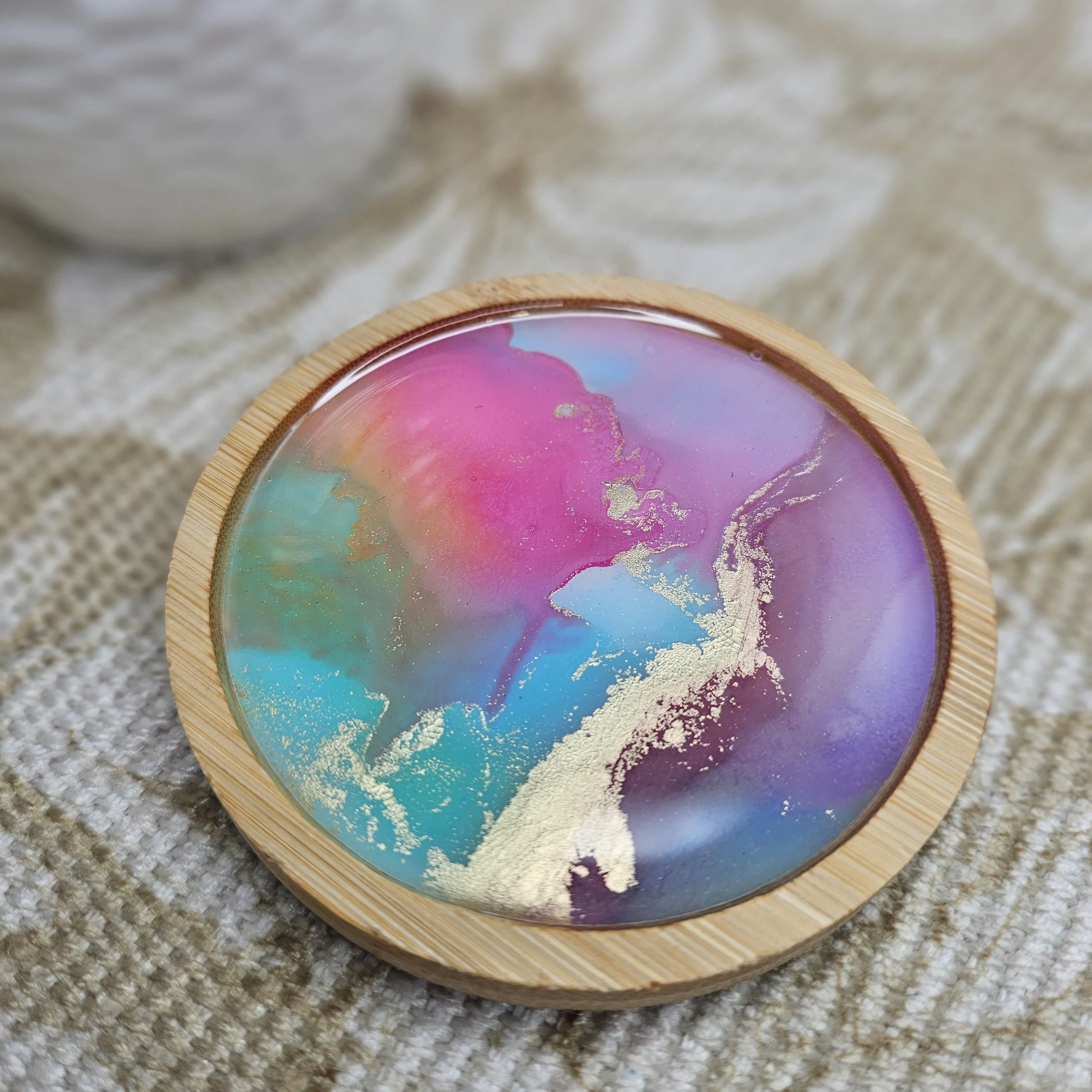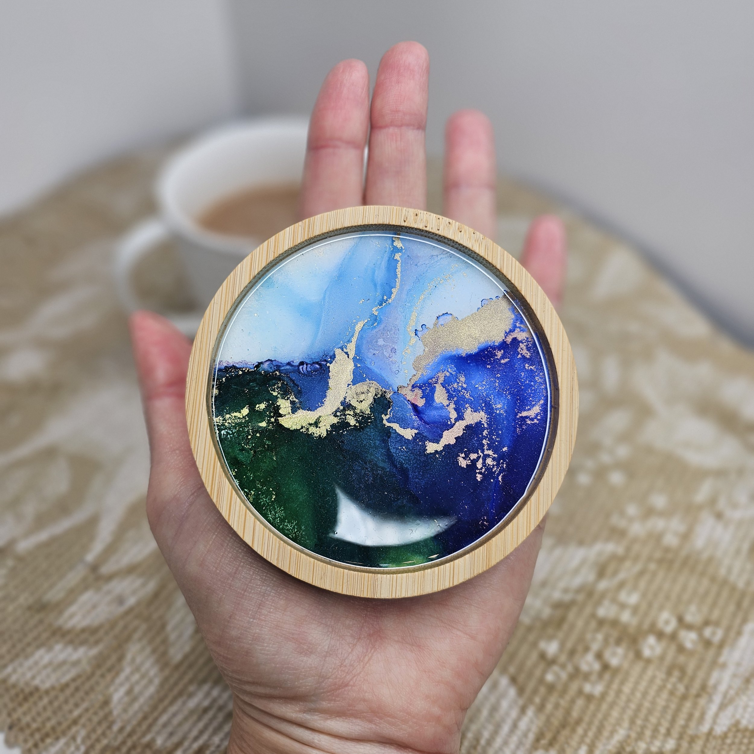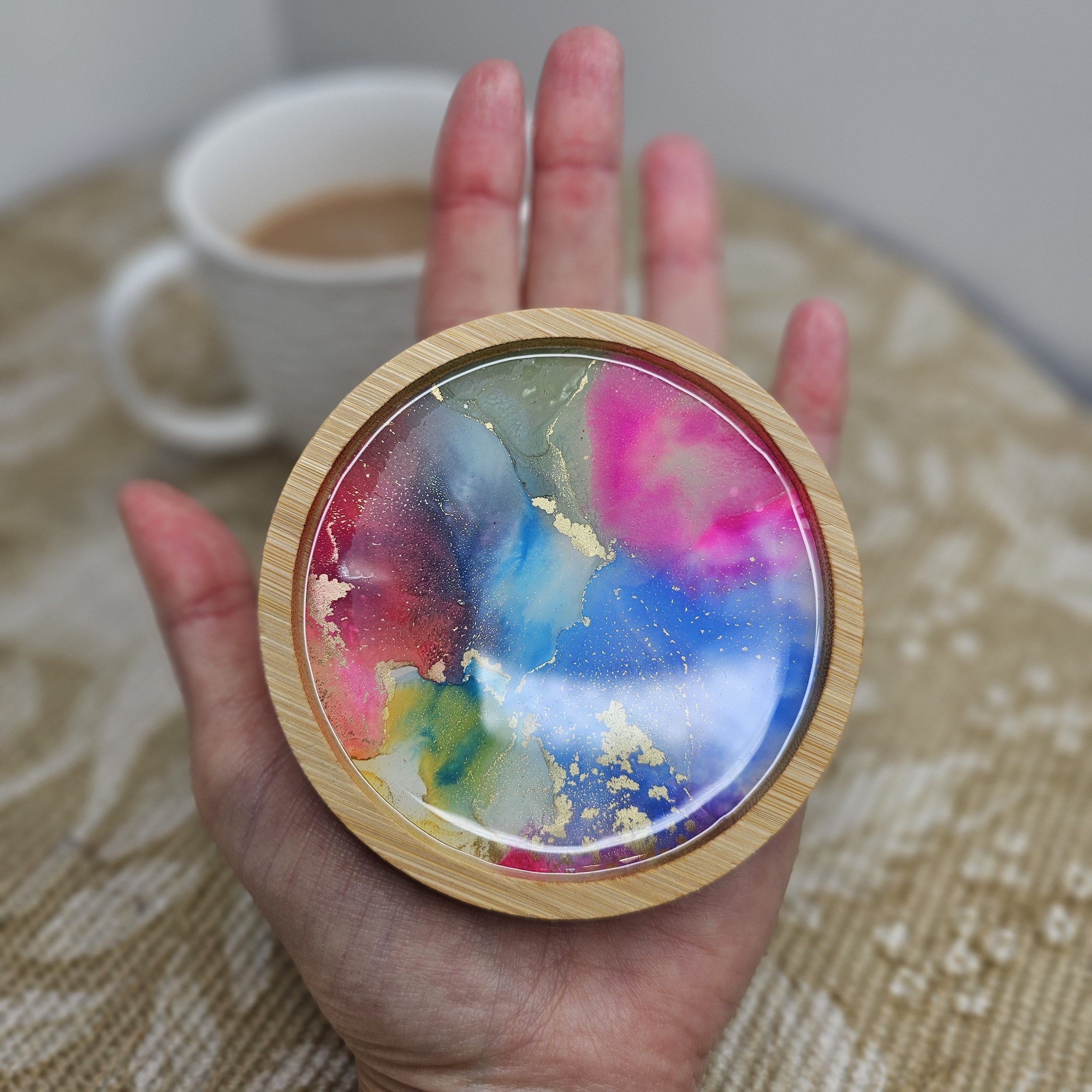 • Each 60mm glass ornament is a unique piece of art, hand-painted using vibrant abstract alcohol inks. They feature a gold cap and comes complete with a hand-tied satin ribbon, ready for display.