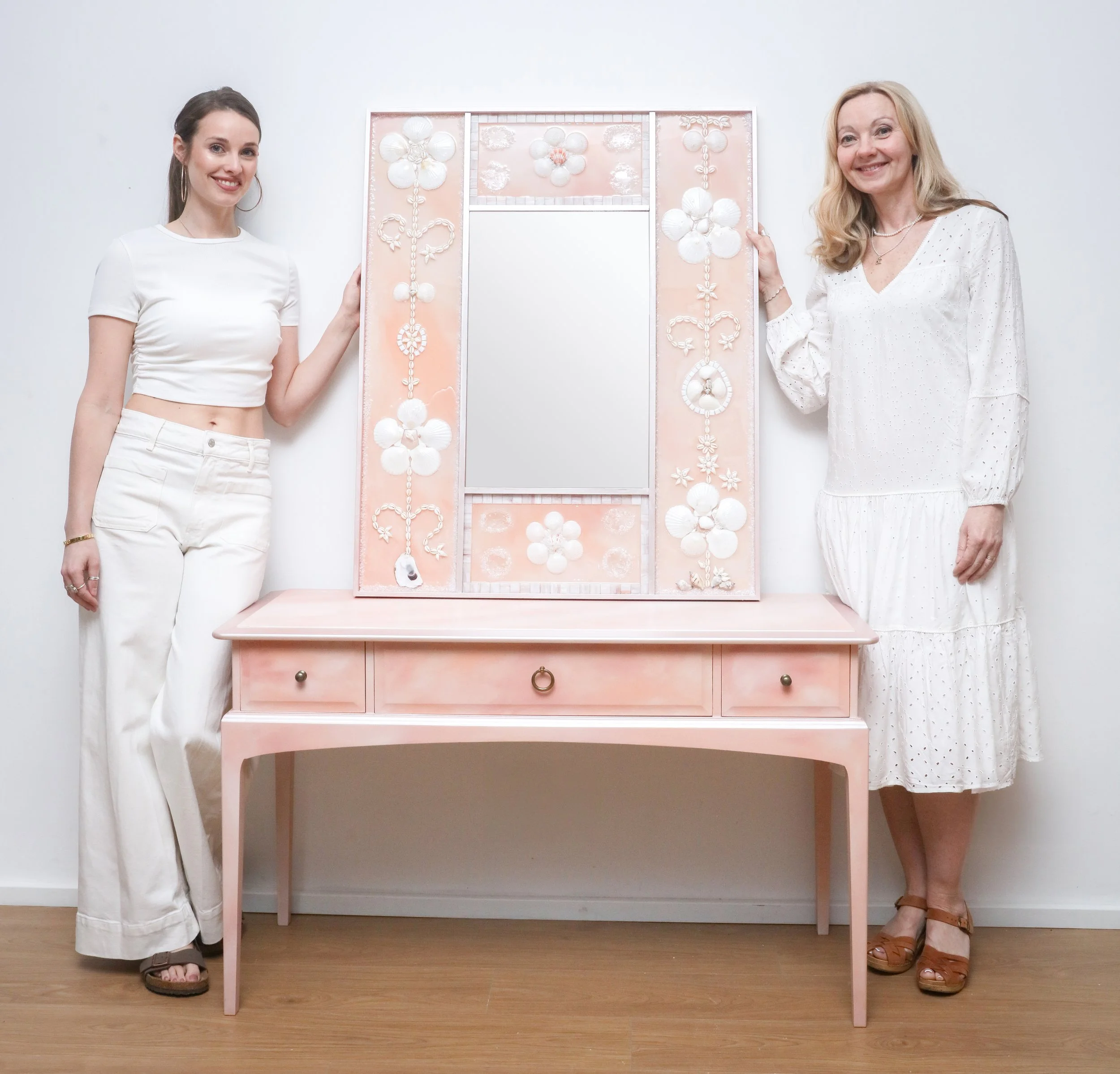 This handmade mirror has been designed and handmade to match this reclaimed Stag dressing table. Both handpainted in a whimsical soft feathered effect in pinks and whites which compliments the handplaced shell mosaic detailing set in resin.