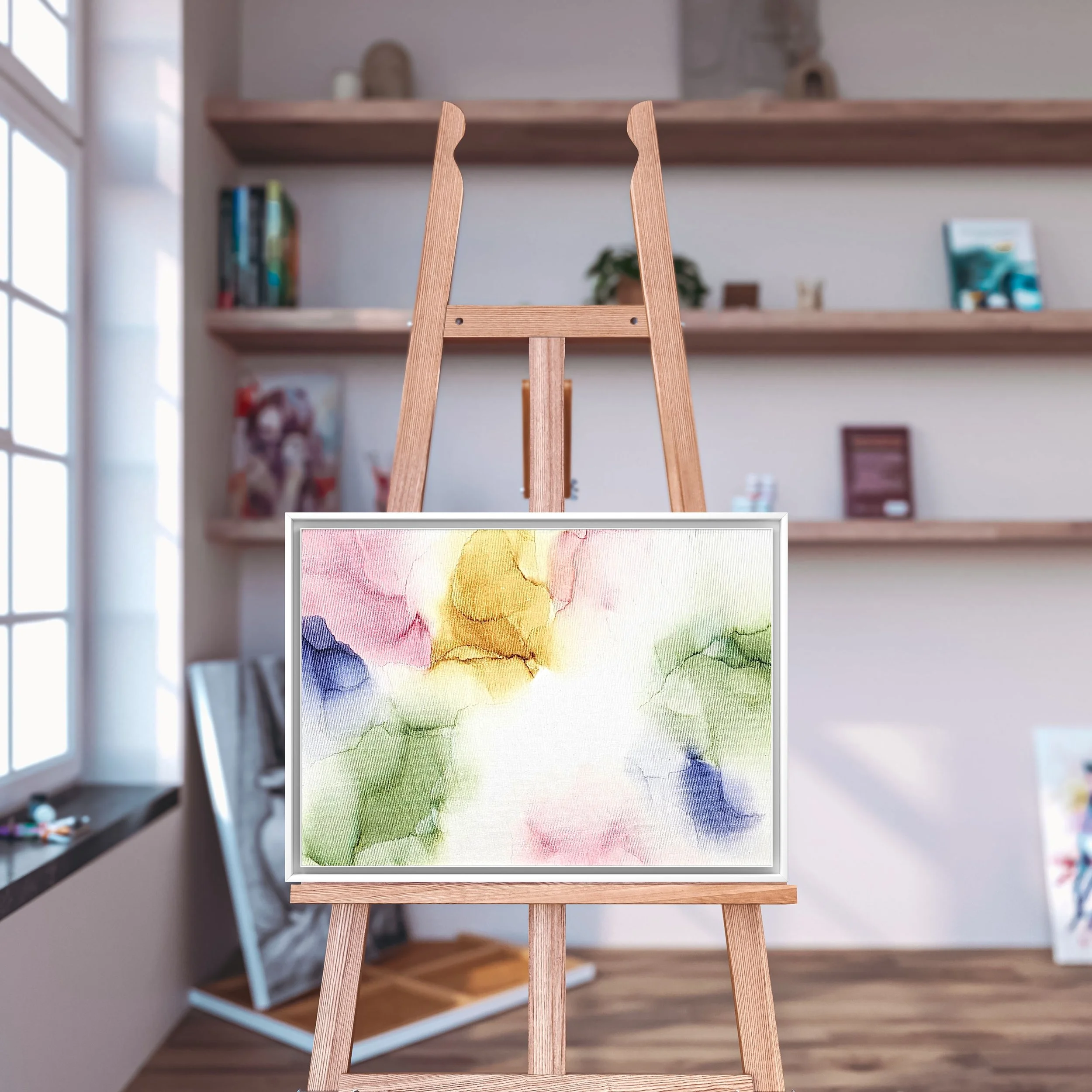 "In The Clouds" captures the ethereal feeling of floating high above the world. Soft and wispy patterns with gentle washes of pastel pink, olive green, and violet blend across the textured canvas, creating a dreamy and airy escape for your home.